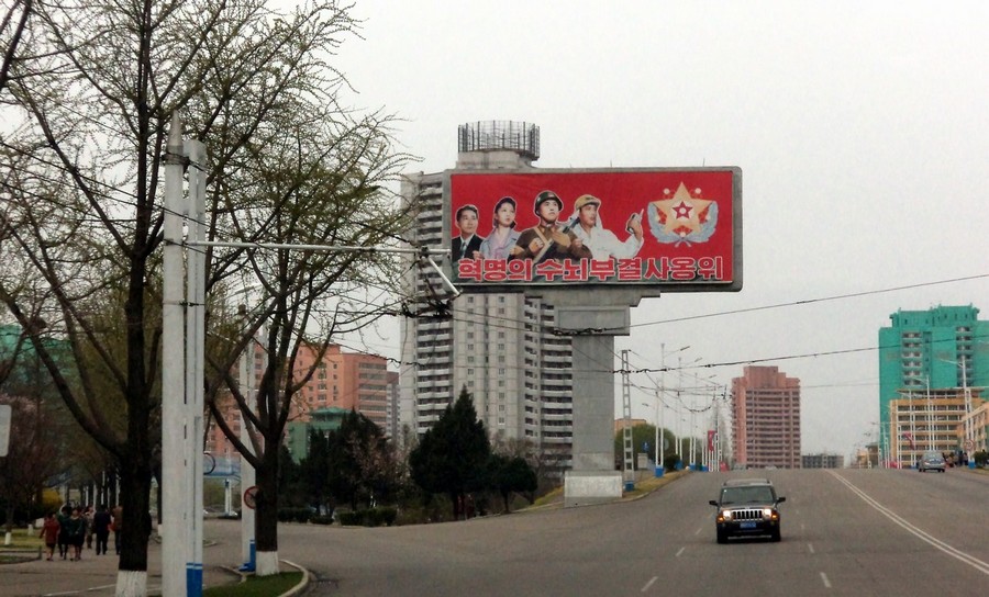 Hlavní třída Kwangbok (Osvobození) z centra města do Mangjongde má v každém směru mezi tramvajovými kolejemi asi čtyři jízdní pruhy, ale chybí vodorovné dopravní značení, takže si každý jezdí, kudy chce, často cikcak podle stavu asfaltu, jenž není zdaleka optimální, ale také ne úplně tragický. Nikoli tankodrom, ale pestrá mozaika záplat, jakou můžeme leckde na silnici vidět i u nás. Zeleň je vzorně ostříhána a udržována.