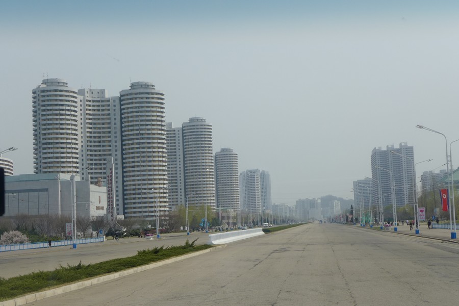 Prostorná třída Kwangbok (Osvobození) v Pchjongjangu-Mangjongde s minimálním silničním provozem