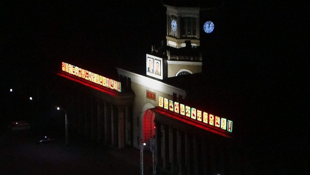 Za mých návštěv bylo město asi do jedné hodiny v noci celkem dobře osvětleno, zhruba srovnatelně s českými zvyklostmi, někde možná o něco méně. V jednu hodinu v noci se ale celé ponořilo do tmy a svítilo jen několik obrazů slunečně usměvavých velkých vůdců a hlavní agitační hesla (například obrovská neonová hesla na budově hlavního nádraží, dlouhá desítky metrů), jak jsem měl možnost pozorovat z oken hotelového pokoje. Na poměry skoro třímilionového velkoměsta to působilo značně neobvykle, ale nepovažuji to za nepatřičné, dlouhé ponocování a bujarý noční život se tam nenosí, a pokud někdo v noci cestuje, posvítí si baterkou, telefonem nebo světly vozu, takže není třeba plýtvat elektřinou pro lampy. (Na to už přišli i v některých českých městech. V době, kdy píši tuto publikaci, se začíná v naší zemi šetřit na energiích takovým způsobem, že leckde už znají zimu a tmu jako v KLDR, a bude asi ještě hůře…) Každopádně své osobité kouzlo měl pohled z hotelu na velkoměsto ponořené do tmy, do níž zářili jen velcí vůdci, hesla, občas někde svítilo okno v domě (z toho bylo patrné, že elektřina funguje normálně) a do tmy si svítila pomalu jedoucí tramvaj, jezdící i za nejhlubší noci. Náš denní program byl ale celkem nabitý a bylo nutno i spát, takže jsem se nemohl v noci dlouhodobě kochat pohledem z okna a tyto výjevy jsem zaznamenal jen náhodně.