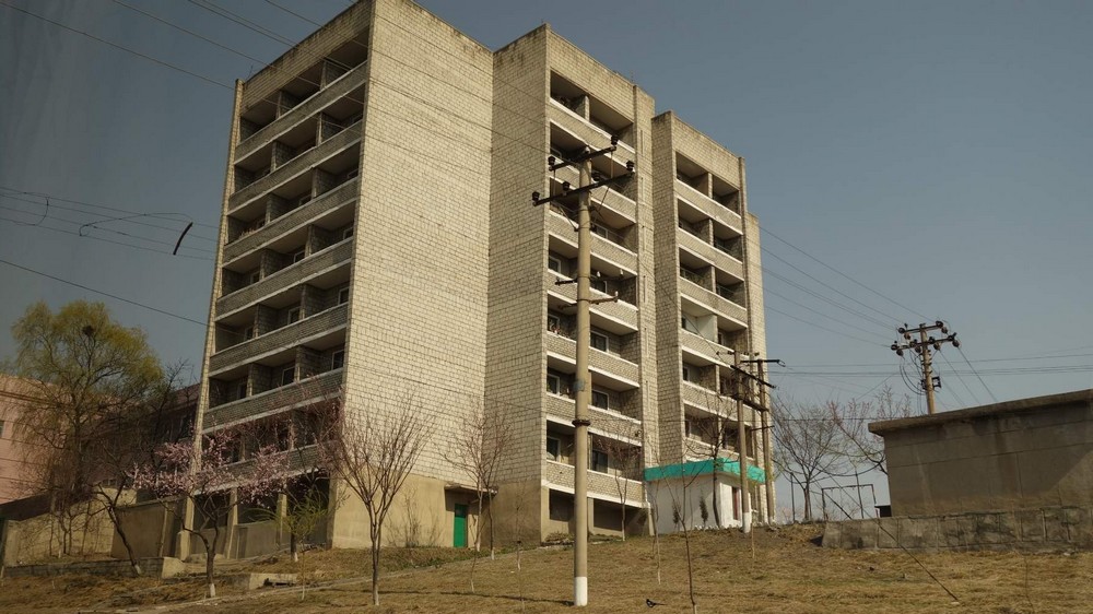V Mangjongde poblíž rodného domu stojí také neomítané bytové domy z tvárnic, asi sedmipatrové, takže na poměry hlavního města spíše nižší. Svými ne moc pohlednými fasádami připomínají zástavbu někdejšího SSSR nebo naše průmyslové objekty z první republiky. Podobné několikapatrové neomítané domy jsem viděl i na venkově. Boční ulice jsou běžně jen prašné, nezpevněné. Vzduchem vede sem a tam spousta drátů na sloupech.