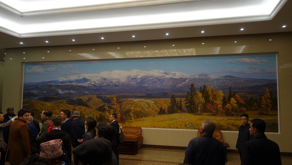 Vstupní sál Muzea korejské revoluce s obrazem Čong Ilova štítu na Pektusanu