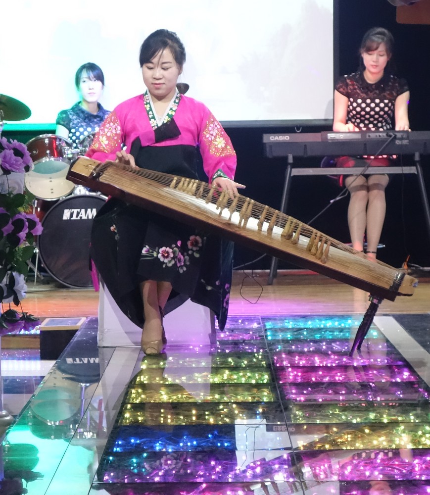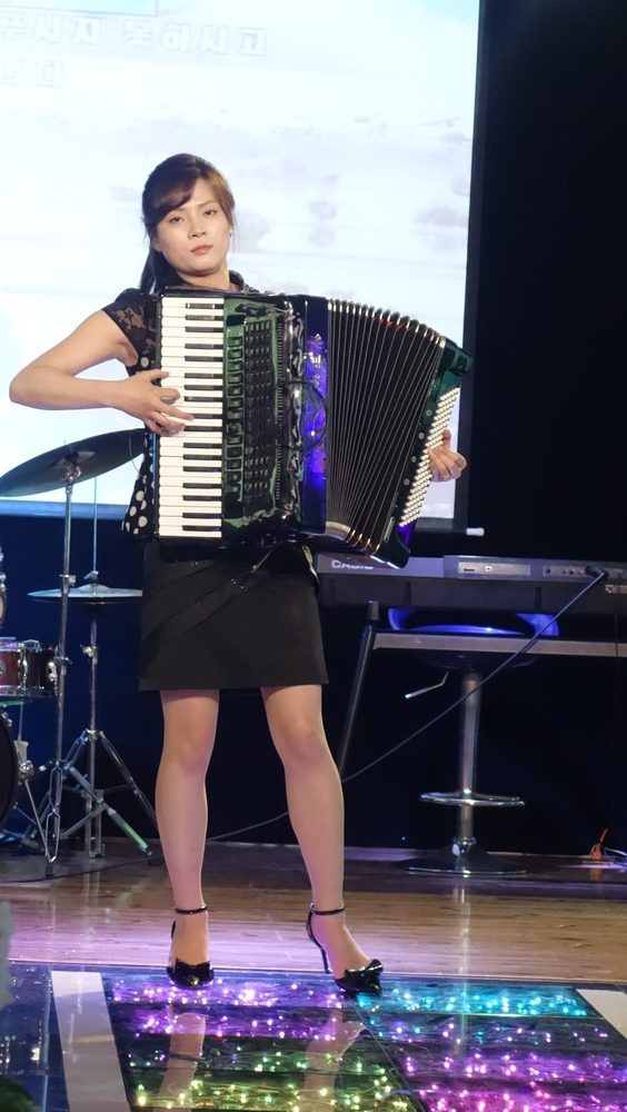 Účastníci z různých zemí zazpívali s doprovodem korejských hudebnic revoluční a lidové písně ze svých zemí i z Koreje, nechyběla ukázka recitace a tance. Své vystoupení si připravili i korejští průvodci a průvodkyně. Korejské umělkyně předvedly korejský zpěv, tanec s vějíři a hru na akordeon a tradiční korejský strunný nástroj kajagum. Soudružka harmonikářka byla krásná, vpravdě výstavní korejská žena a zaujalo mě, že tahací harmonika dosahuje rozměru třetiny výšky její postavy.