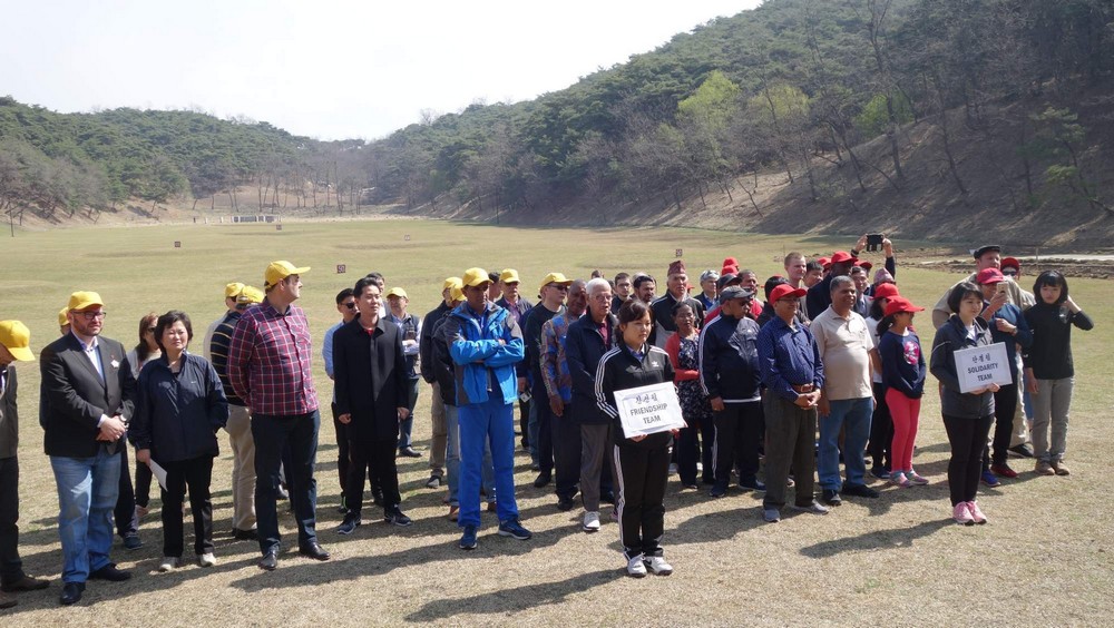 Zahájení sportovních her na hřišti Pchjongjangského golfového klubu – týmy Přátelství a Solidarita se řadí za korejské soudružky v teplákových soupravách Adidas