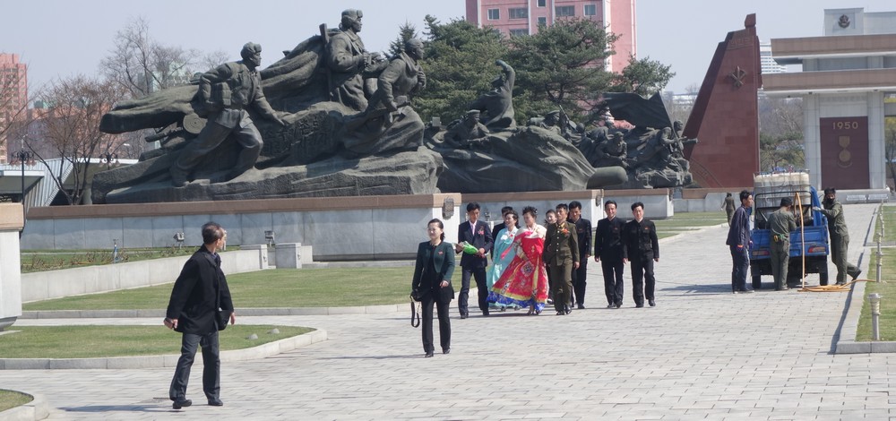 V areálu muzea jsem viděl také vojenskou svatbu, vojáka v typické zelenohnědé uniformě typu inminboku s novomanželkou v pestrobarevném čoson-otu s asi desetičlenných doprovodem svatebčanů.