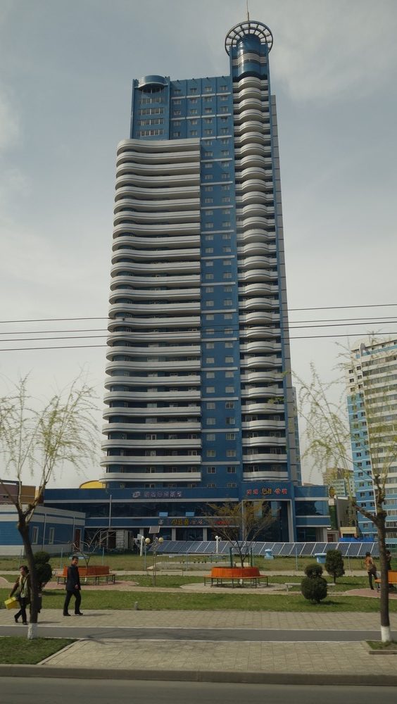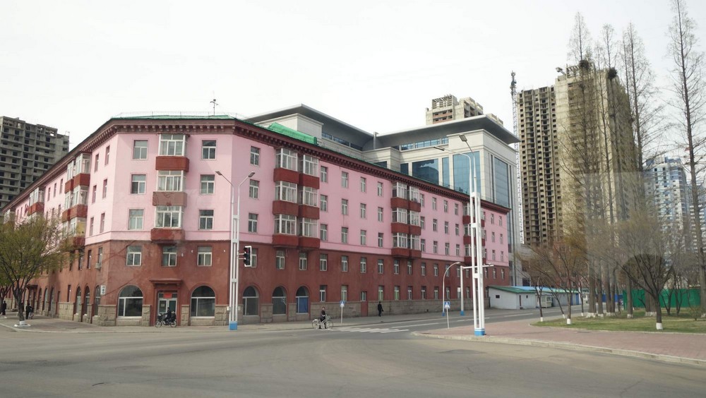 Ukázka moderní zástavby v centru Pchjongjangu – ulice vědců Mire