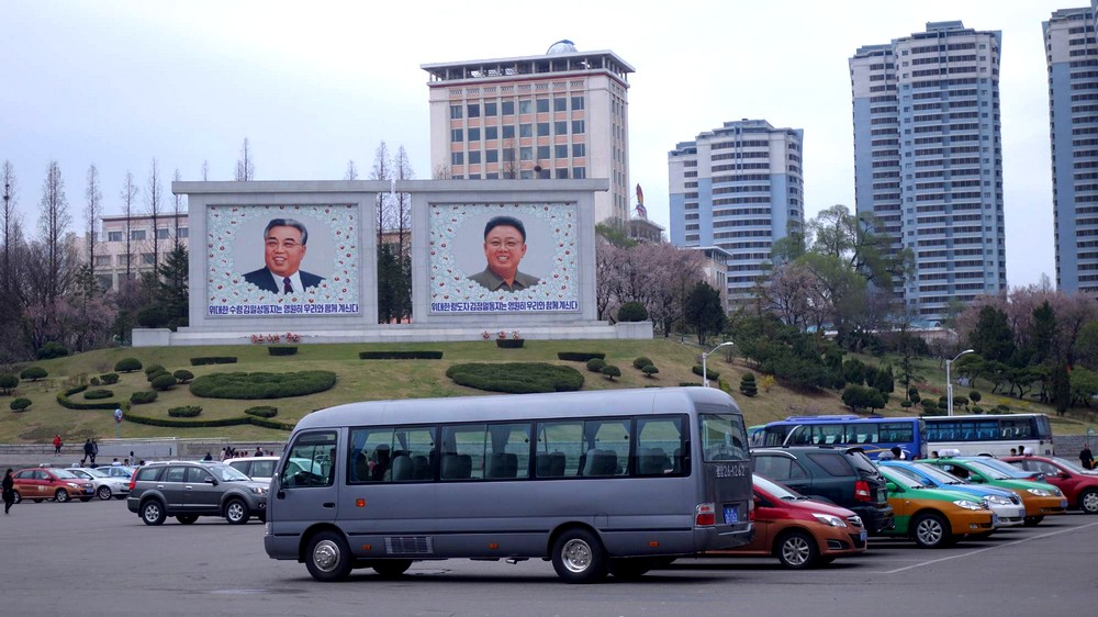 Nemohu opomenout, že v těsné blízkosti náměstí směrem na Mansude a k Paláci školáků stojí nad parkovištěm a u zastávek trolejbusu dvě rozměrné mozaiky slunečně usměvavých velkých vůdců obklopených magnóliemi. Každá stěna s mozaikou měří mým odhadem asi 12 x 10 metrů. Velcí vůdci se tak na náměstí nedívají jen čelně z obrazů, ale i průhledem zboku z mozaik.