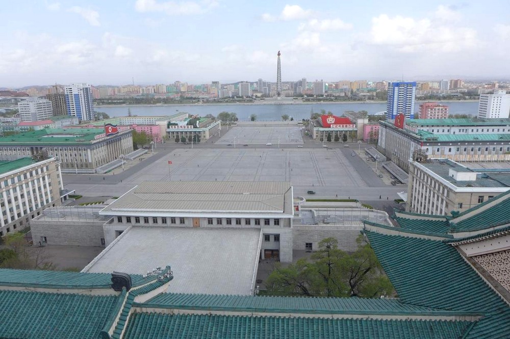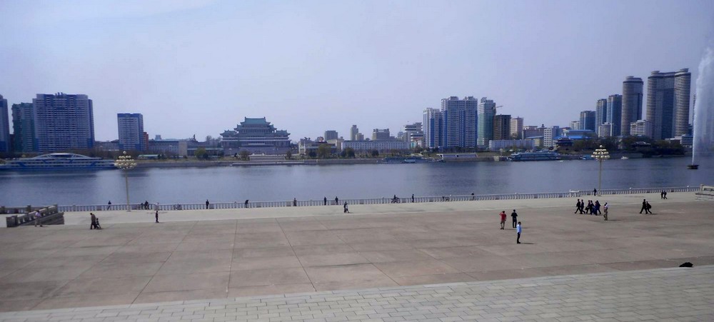 KIM IR SENOVO náměstí s Velkou lidovou studovnou a jeho okolí v pohledu přes řeku Tedong od Věže čučche