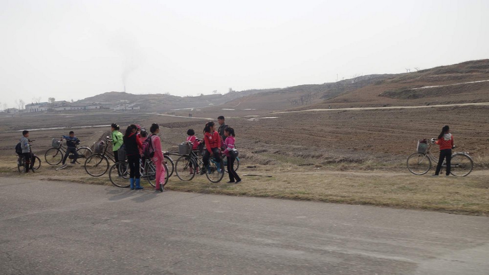 Děti s jízdními koly u dálnice z Pchjongjangu na Hjangsan