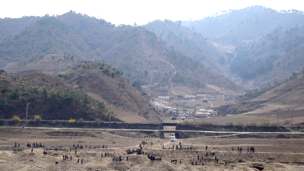 Čím jsme byli dále od hlavního města, tím byly vesnice menší. Větší města jsme viděli jen z velké dálky, dálnice je totiž míjí. Před Hjangsanem dálnice náhle končila a sjíždělo se z ní prudkým obloukem do města. Rovně vedl nedostavěný, zjevně už dlouho opuštěný betonový most a za ním byl patrný zarůstající zářez a další pozůstatky výstavby pokračování z lepších časů, na jehož dostavbu už se zjevně dávno rezignovalo. (Ne, že by takové případy u nás nebyly.) Cestou bylo vidět i několik dalších dávno rozestavěných a opuštěných dopravních staveb.