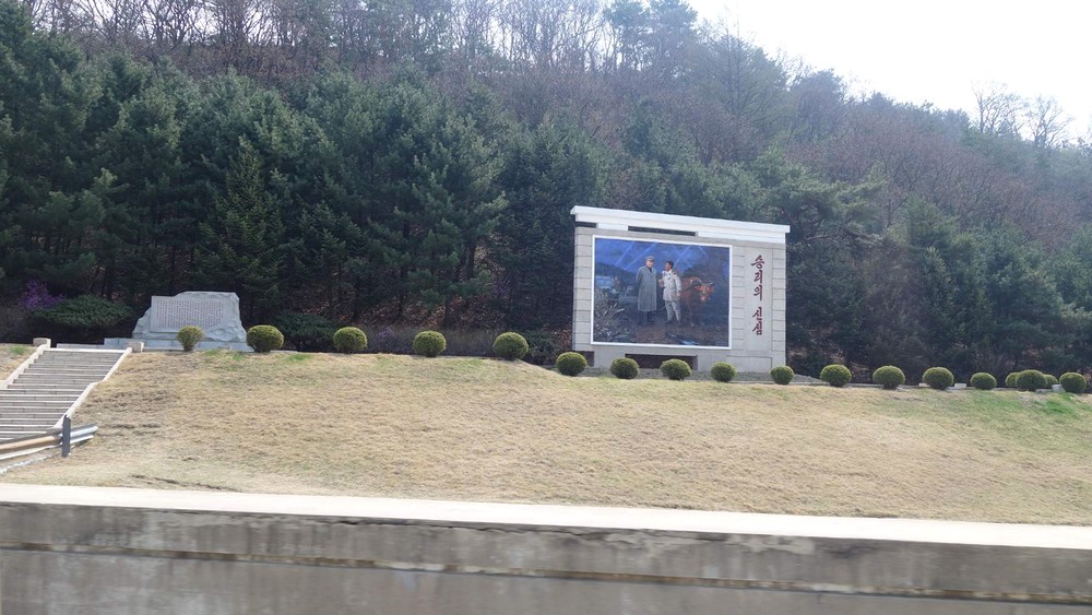 Dálnice se zástavbě vyhýbala a ta byla tedy vidět většinou jen poměrně zdálky. Nejdelší agitační hesla, umístěná na řadách kamenných desek, z nichž každá nesla jednu slabiku, byla dlouhá snad až 150 metrů, když to na snímcích porovnávám s rozměry zástavby. Hesla provolávala slávu Korejské straně práce, revoluci čučche, velkému kimirsen-kimčongilismu a váženému soudruhu nejvyššímu vůdci či vyzývala ke splnění závěrů 7. sjezdu strany a tehdejší pětiletky (2016–2020). Výjimečně byla k vidění i stěna s mozaikou s velkým vůdcem mezi rolníky, sloup věčnosti nebo jiný pomník. Velkolepě působila v Mjohjangsanu hesla vyrytá vysoko ve skalách. Nad mjohjangsanským údolím je na skalním štítu vyryto „Songunský velitel generál Kim Čong Il čučche 96. 2. 16“, tedy 16. 2. 2007 (den 65. narozenin velkého generála, přičemž tento byl už od roku 1992 maršálem). Rozměry hesla zdálky mohu těžko určit, ale myslím, že je dlouhé alespoň 30 metrů. V KLDR je podobných skalních hesel poměrně mnoho, jistě od skalních aktivistů. Některé opěrné stěny podél dálnice byly ozdobeny malými betonovými pěticípými hvězdami.