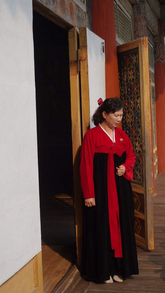 K závěru prohlídky patřila návštěva prodejny suvenýrů s prodavačkami někdy v pestrobarevném čoson-otu a někdy civilně oblečenými v bundách a kalhotách, bez podnikové visačky. Jedna z prodavaček v čoson-otu měla venku před obchodem stát lodičky na výstředně vysokých podpatcích. Kam v nich v této venkovské krajině chodila, nevím, ale k buddhistickému klášteru to vizuálně patřilo asi tak jako pionýrské šátky a „maoistické“ čepice, spíše ještě méně.