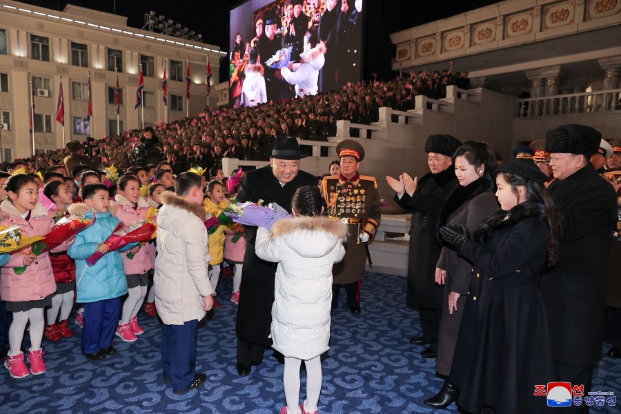 Generální tajemník Korejské strany práce a předseda pro státní záležitosti Korejské lidově demokratické republiky vážený soudruh Kim Čong Un se dostavil na náměstí spolu se svou milovanou dcerou a manželkou Ri Sol Džu.