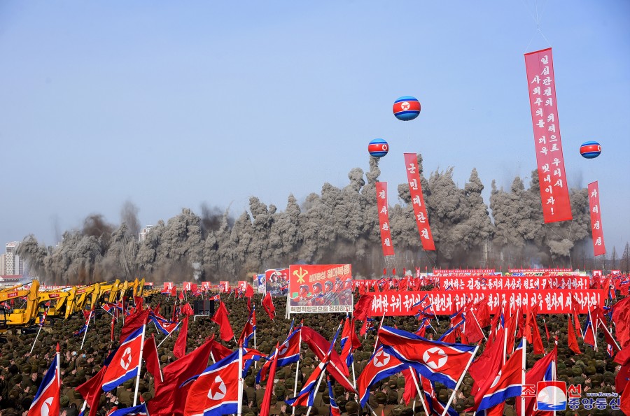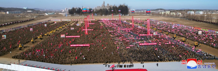 Vážený soudruh Kim Čong Un osobně stiskl tlačítko elektrické rozbušky, aby zahájil druhou etapu výstavby obytných budov s 10 tisíci bytů v oblasti Hwasong.