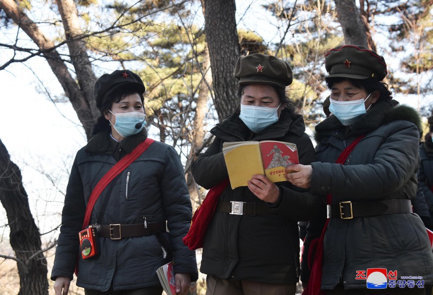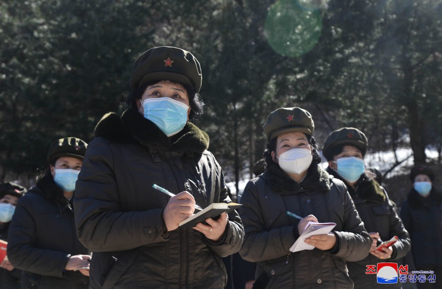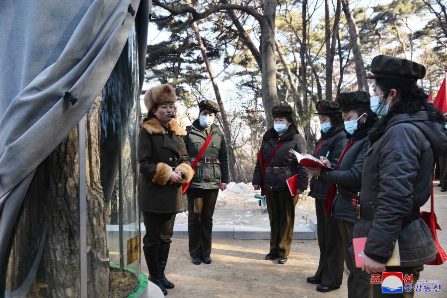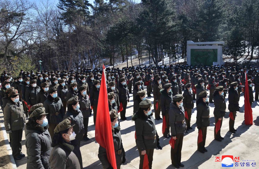 Pchjongjang 22. února čučche 112 (2023) (KCNA) – Funkcionářky a členky svazu žen provedly 21. února studijní pochod na revoluční bojiště Madusan.