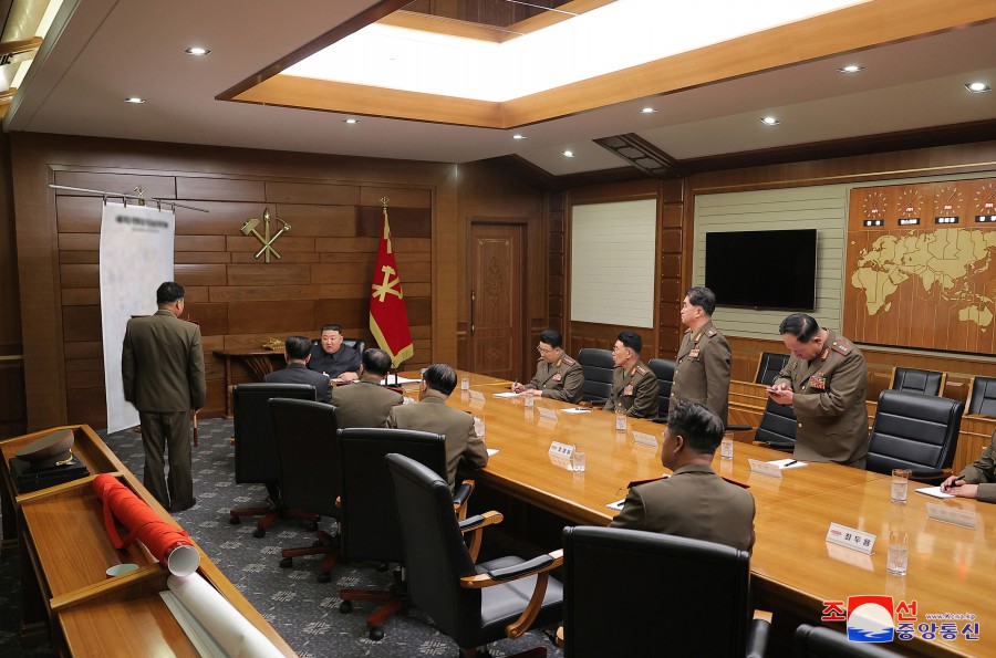 Vážený soudruh Kim Čong Un při seznámení s plánem frontové útočné operace a různými bojovými dokumenty upozornil na zásadní problémy, které vyvstávají při neustálém studiu a zavádění vojenských opatření k neustálému zlepšování a zdokonalování armády vést válku.
