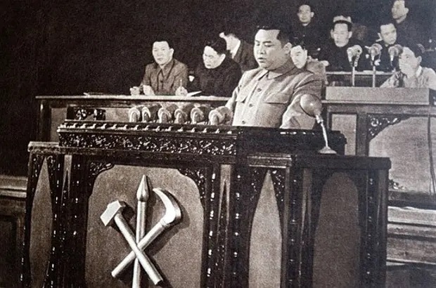 Projev Kim Ir Sena na 3. sjezdu Korejské strany práce v dubnu 1956. Zdroj: theguardian.com