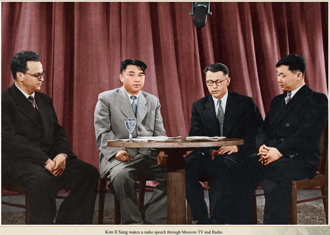 Kim Ir Sen přednáší projev pro moskevskou televizi a rozhlas v červenci 1956. Zdroj: Nakladatelství cizojazyčné literatury (KLDR)