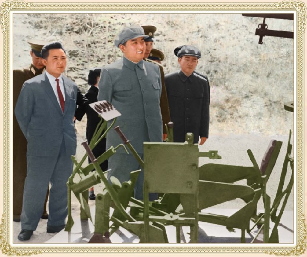 Kim Ir Sen a Kim Čong Il na návštěvě jednotky Korejské lidové armády v květnu 1965. Zdroj: Nakladatelství cizojazyčné literatury (KLDR)