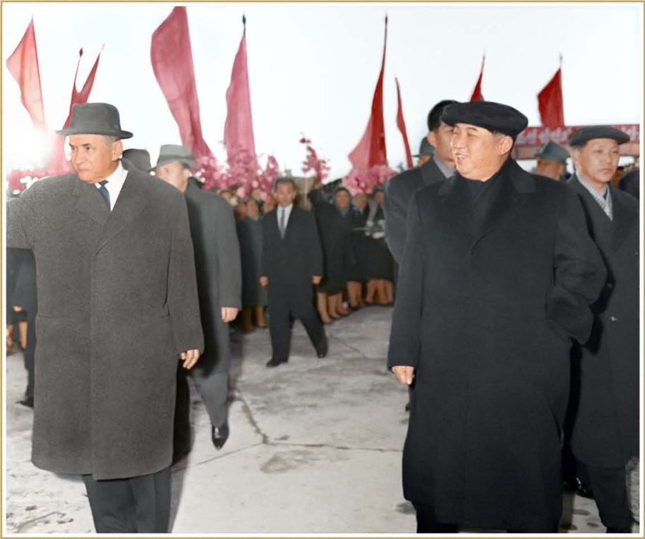 Kim Ir Sen s předsedou rady ministrů SSSR A. N. Kosyginem na návštěvě KLDR v únoru 1965. Zdroj: Nakladatelství cizojazyčné literatury (KLDR)