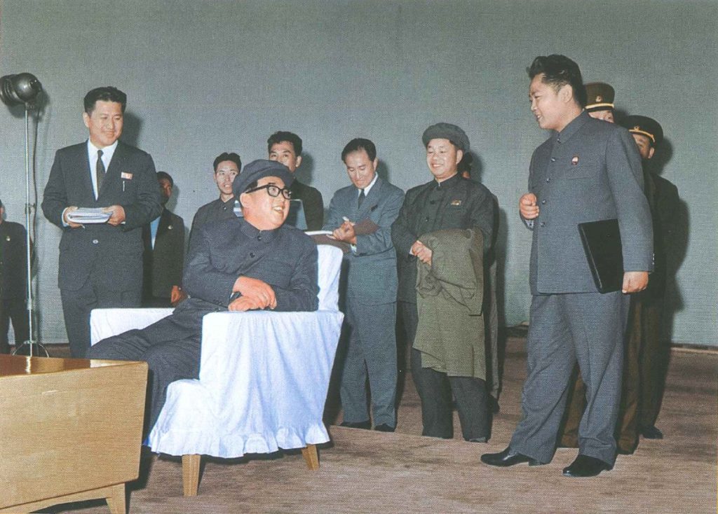 Kim Ir Sen a Kim Čong Il při návštěvě „Korejského filmového studia 8. února“, říjen 1971. Zdroj: Nakladatelství cizojazyčné literatury (KLDR)