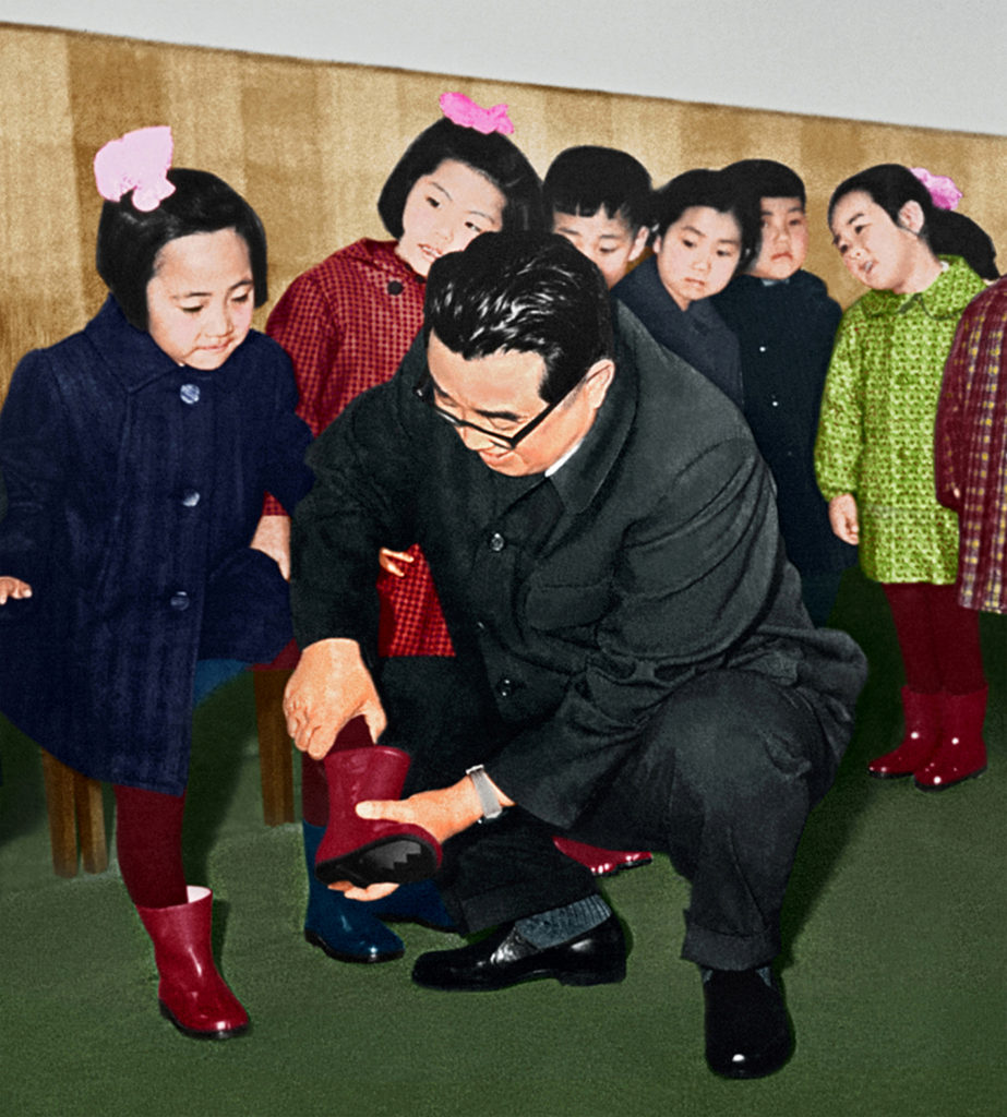 Kim Ir Sen kontroluje dětskou obuv v mateřské školce, březen 1971. Zdroj: Nakladatelství cizojazyčné literatury (KLDR)