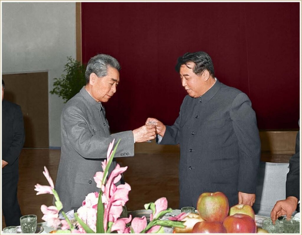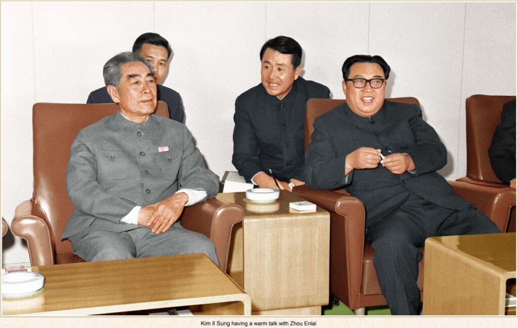 Kim Ir Sen v srdečném rozhovoru s Čou En-lajem v Pchjongjangu v dubnu 1970. Zdroj: Nakladatelství cizojazyčné literatury (KLDR)