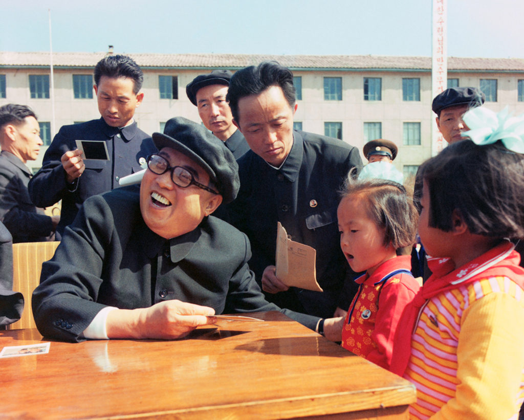 Kim Ir Sen si prohlíží vlastnoručně pořízené snímky dětí v nových školních uniformách, duben 1977. Zdroj: Nakladatelství cizojazyčné literatury (KLDR)