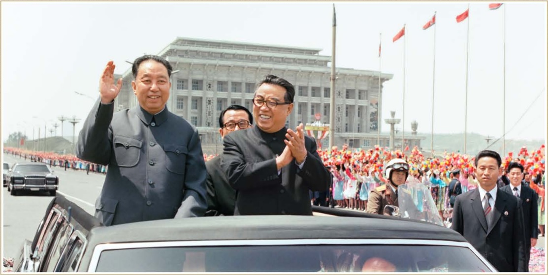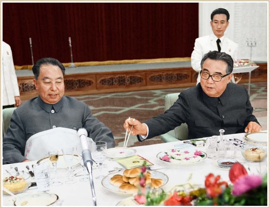 Kim Ir Sen s předsedou Komunistické strany Číny a předsedou vlády Čínské lidové republiky Chua Kuo-fengem v Pchjongjangu v květnu 1978. Zdroj: Nakladatelství cizojazyčné literatury (KLDR)