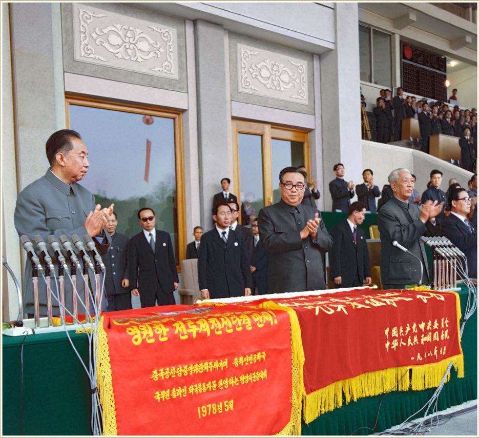Kim Ir Sen s předsedou Komunistické strany Číny a předsedou vlády Čínské lidové republiky Chua Kuo-fengem v Pchjongjangu v květnu 1978. Zdroj: Nakladatelství cizojazyčné literatury (KLDR)