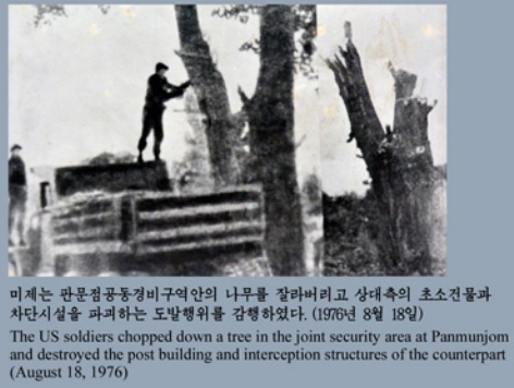 (* Vraždy sekerou – incident v demilitarizované zóně v Pchanmundžomu 18. 8. 1976, kde vojáci Korejské lidové armády zavraždili dva vojáky Armády USA při jejich pokusu o pokácení topolu. O tři dny později vojsko USA za podpory jihokorejských ozbrojených sil strom pokácelo. – https://en.wikipedia.org/wiki/Korean_axe_murder_incident)