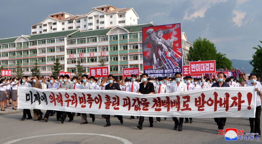 Demonstranti pochodovali, skandovali hesla, vyjadřovali nezkrotnou nenávist k americkým imperialistům a smečce zrádců, kteří mají bláhový sen o zardoušení naší republiky a nyní se uchylují k bezohledným vojenským provokacím proti našemu mocnému státu.