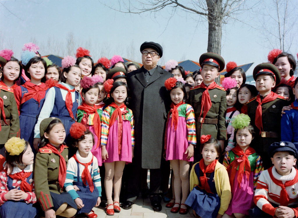 Kim Ir Sen se školáky v zábavním parku Mangjongde, duben 1982. Zdroj: Nakladatelství cizojazyčné literatury (KLDR)