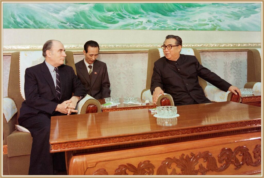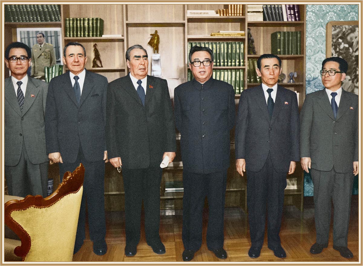 Kim Ir Sen s L. I. Brežněvem, květen 1980. Blíže nepopsaný snímek vydaný Nakladatelstvím cizojazyčné literatury (KLDR) vznikl patrně při setkání na sovětském velvyslanectví v Jugoslávii u příležitosti pohřbu J. B. Tita.