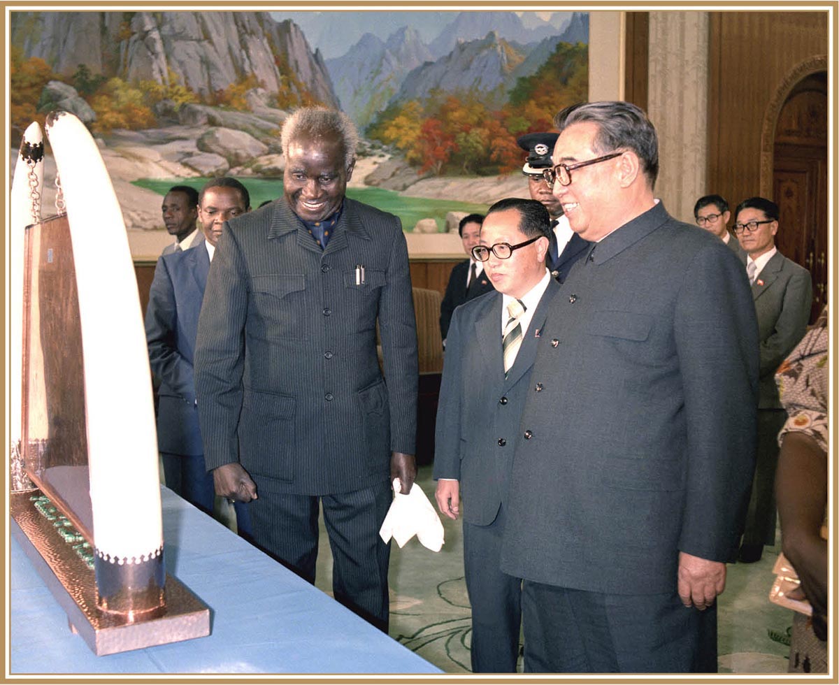 Kim Ir Sen s prezidentem Zambijské republiky Kennethem Davidem Kaundou a darem od něho, duben 1982.
