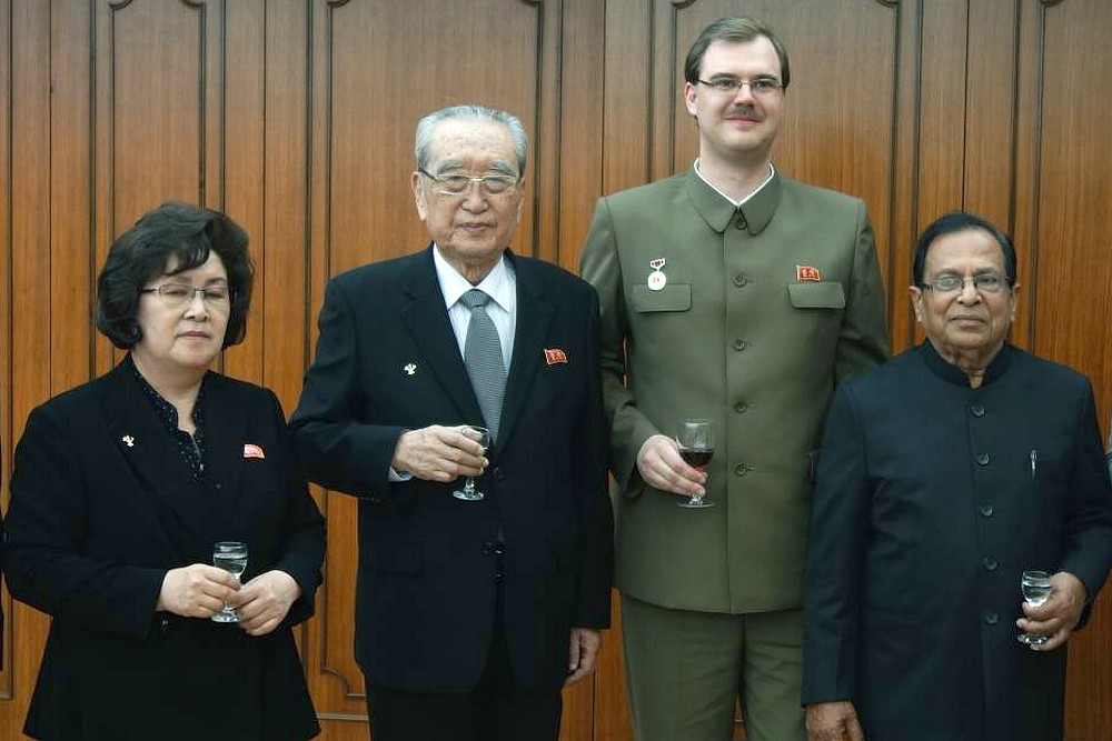 Kim Ki Nam* s Lukášem Vrobelem, Ri Hje Džong (vlevo) a Harishem Guptou (vpravo) na setkání studijních skupin myšlenek čučche v Pchjongjangu v dubnu 2019. Foto Korejský svaz společenských vědců pro kldr.info