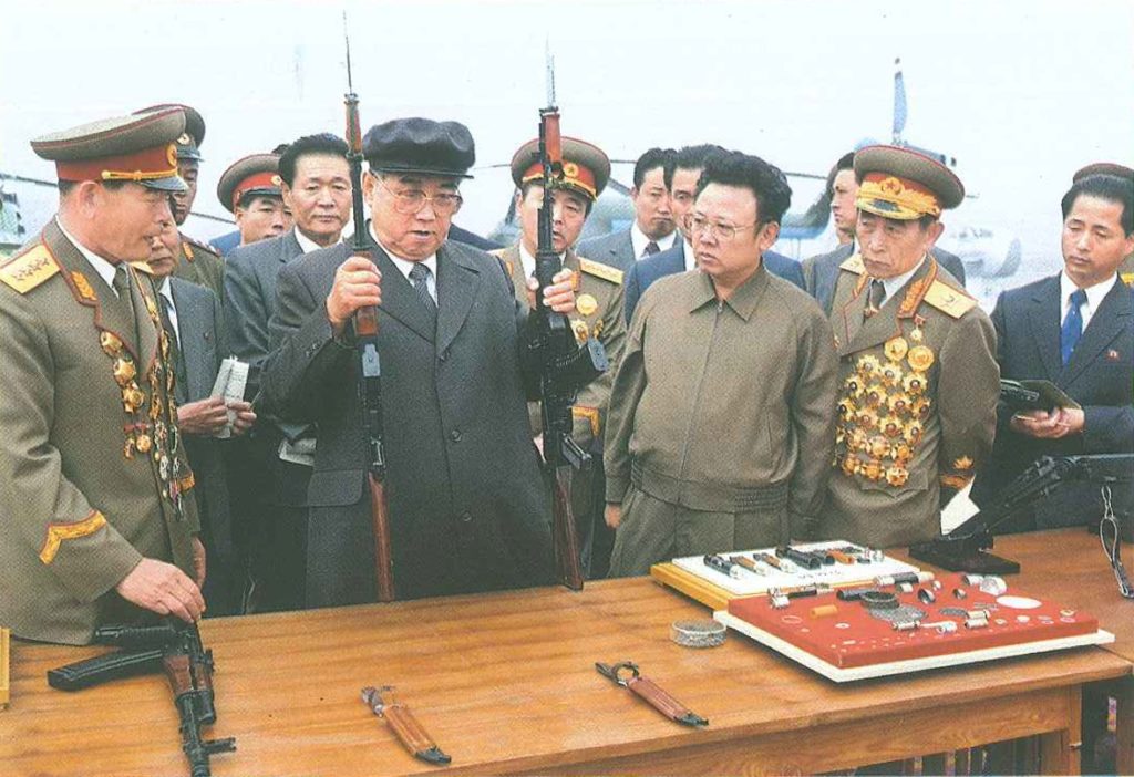 Kim Ir Sen a Kim Čong Il se seznamují s výzbrojí, duben 1986. Zdroj: Nakladatelství cizojazyčné literatury (KLDR)