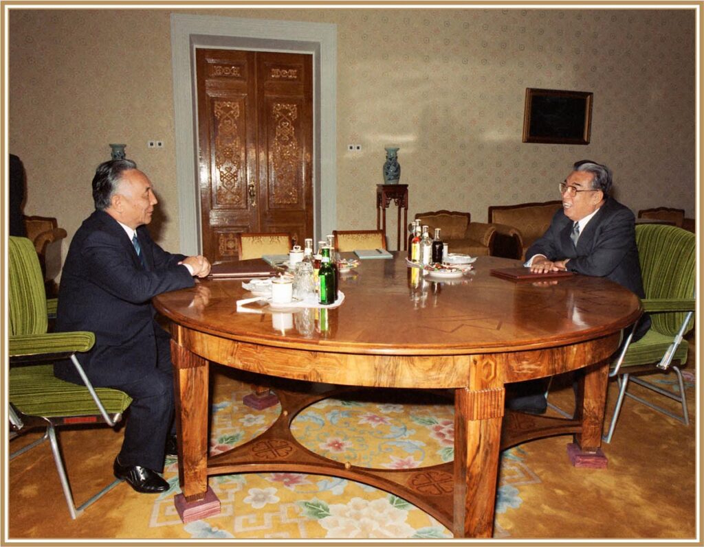 Kim Ir Sen s Džambynem Batmönchem, generálním tajemníkem Ústředního výboru Lidové revoluční strany Mongolska a předsedou prezídia Velkého lidového churalu Mongolské lidové republiky, v červnu 1988. Zdroj: Nakladatelství cizojazyčné literatury (KLDR)