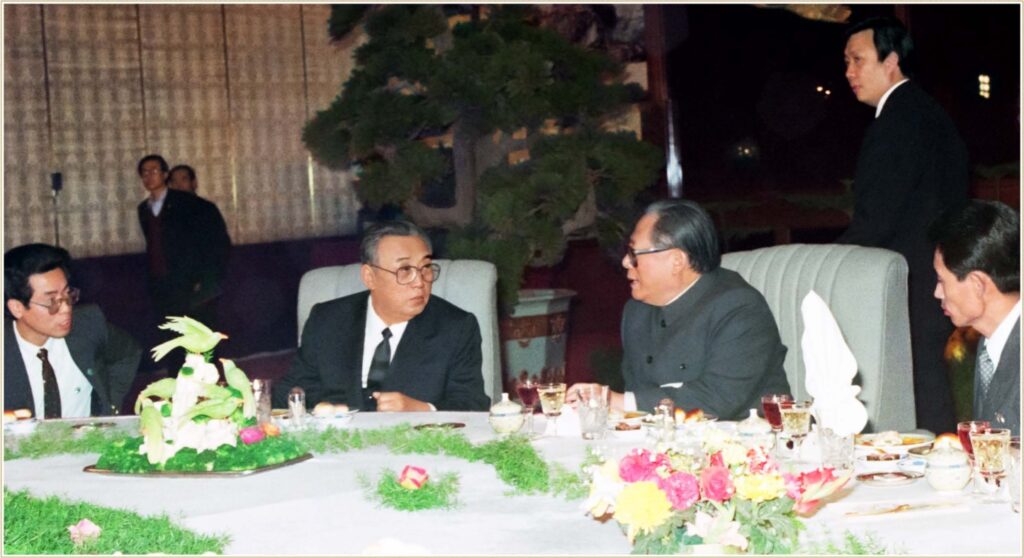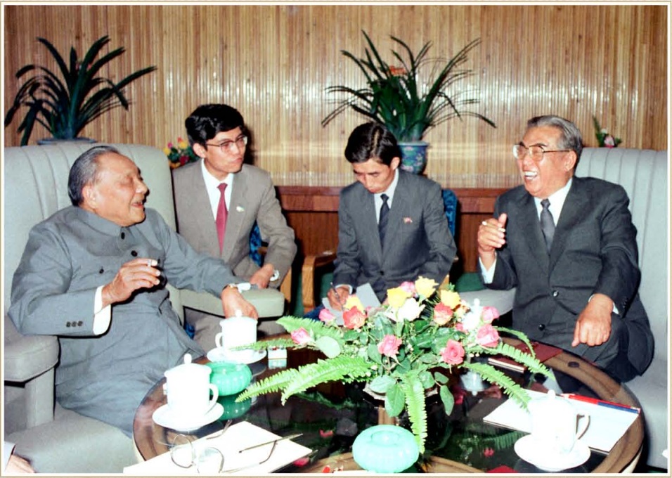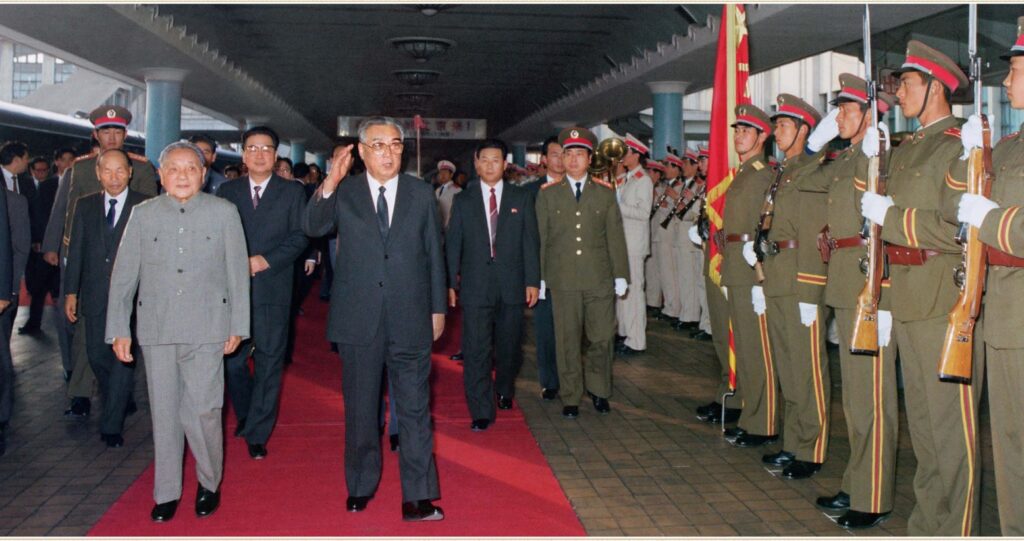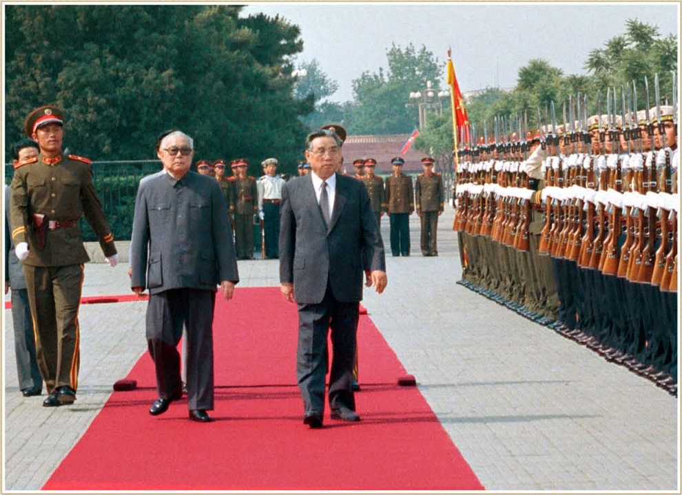 Kim Ir Sen s Teng Siao-pchingem, předsedou Ústřední vojenské komise KS Číny a Ústřední vojenské komise ČLR, v Pekingu v listopadu 1989. Zdroj: Nakladatelství cizojazyčné literatury (KLDR)