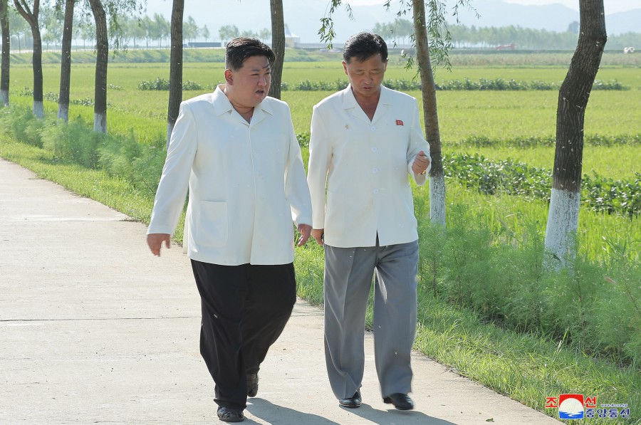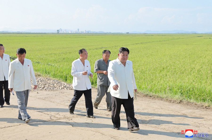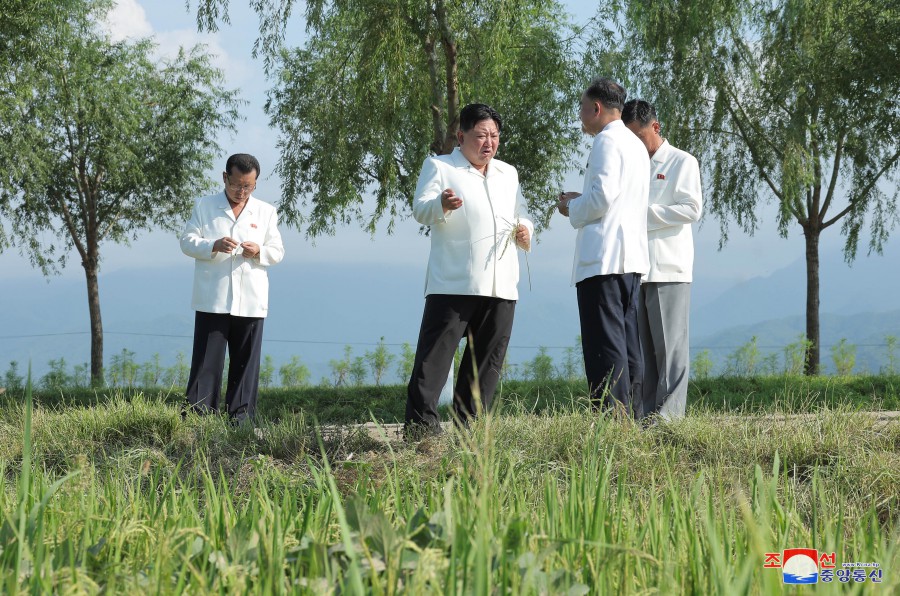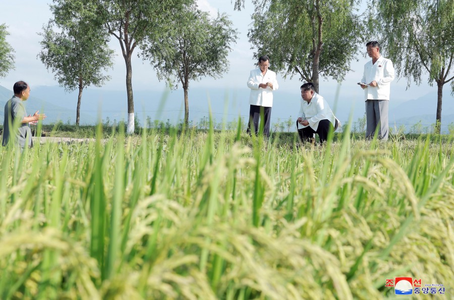 Pchjongjang 18. srpna čučche 112 (2023 (KCNA) – Generální tajemník Korejské strany práce a předseda pro státní záležitosti Korejské lidově demokratické republiky vážený soudruh Kim Čong Un si prohlédl farmy Ogje a Wollang v okrese Anbjon provincie Kangwon, kde na místě řídil práce k odstranění škod na úrodě, způsobených tajfunem.