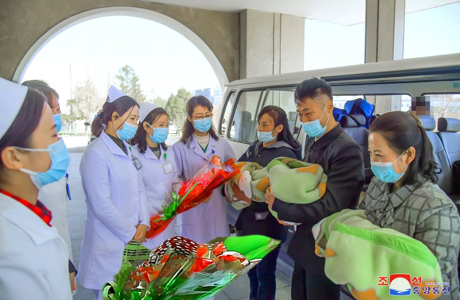 Trojčata, která opustila porodnici v dobrém zdravotním stavu a s dárky jako jsou zlaté prsteny a stříbrem zdobený nůž, byla se svými rodiči srdečně vyprovozena lékaři a sestrami.