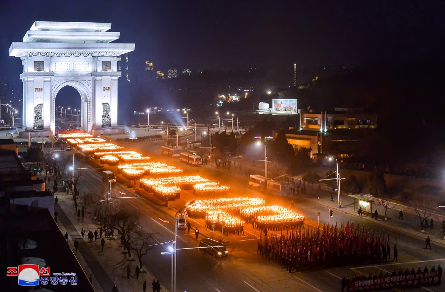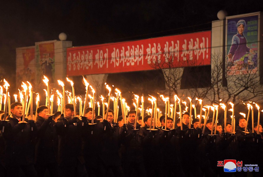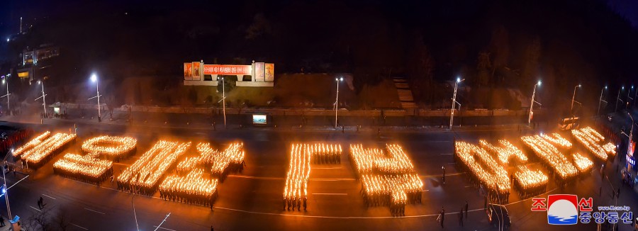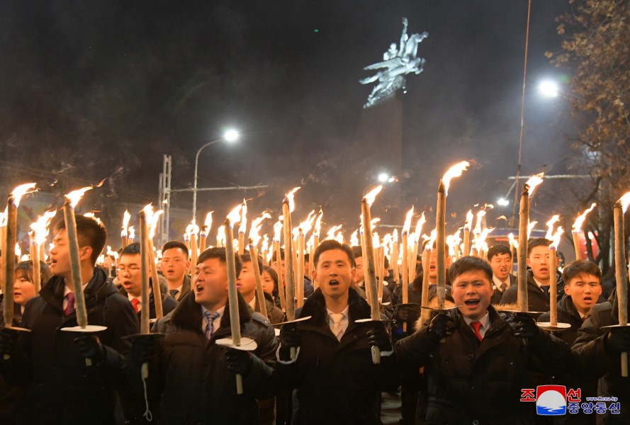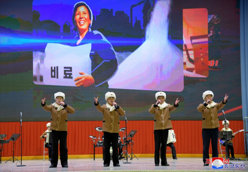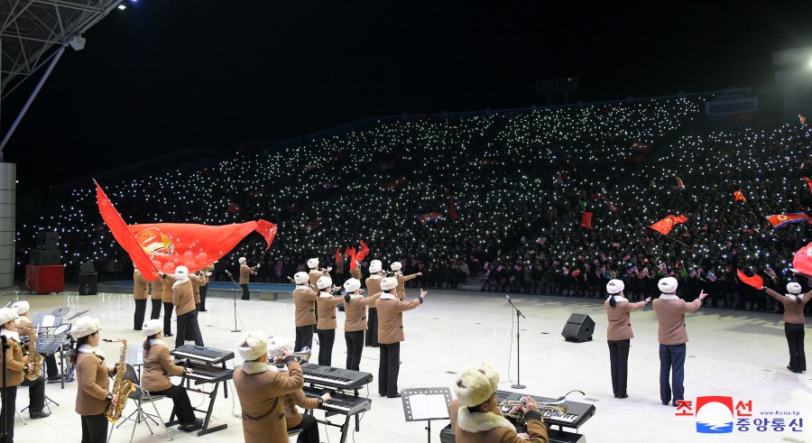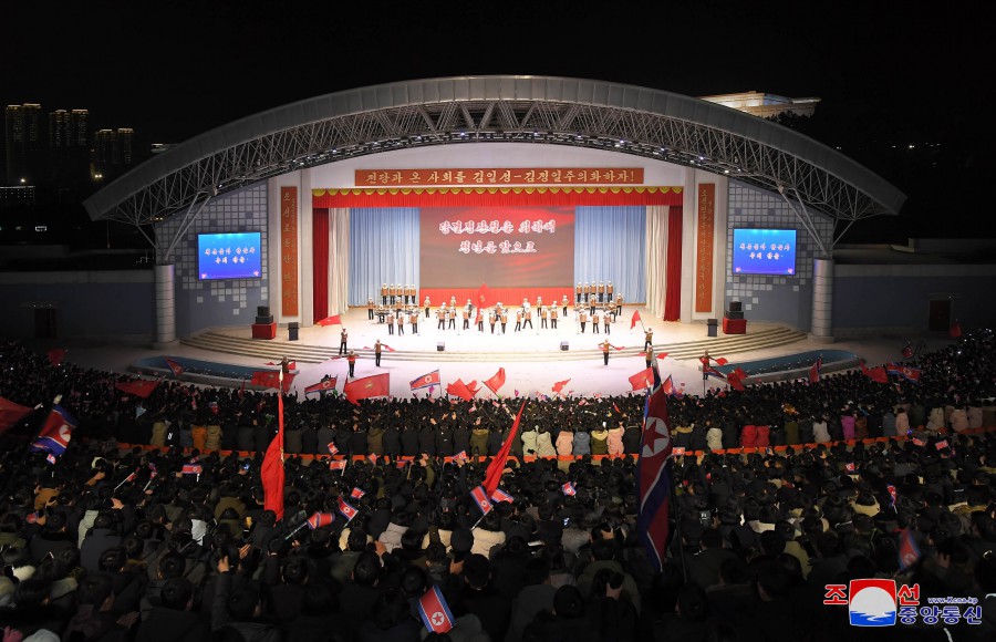 Po pochodňovém průvodu se v Letním divadle Pchjongjangského parku mládeže konalo vystoupení Ústřední umělecké agitační brigády mládeže.