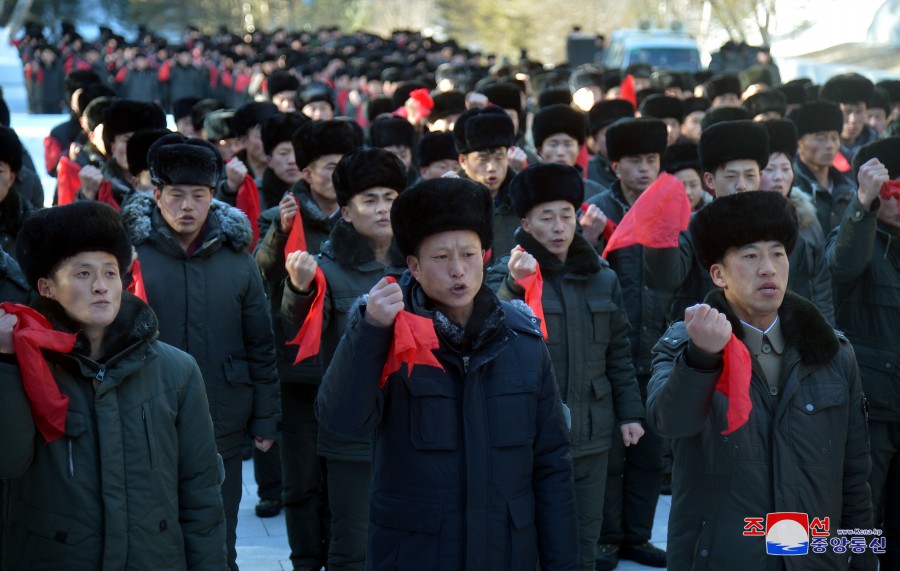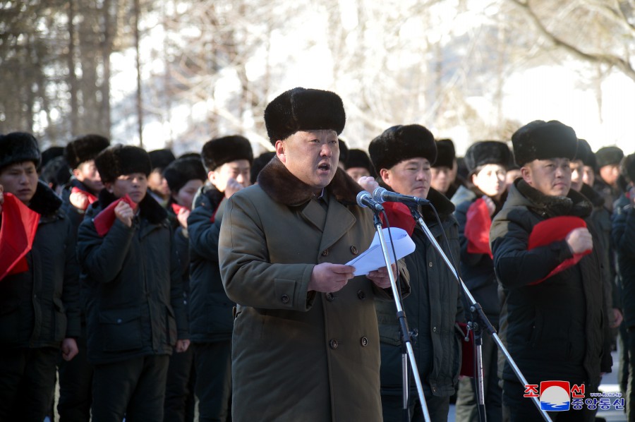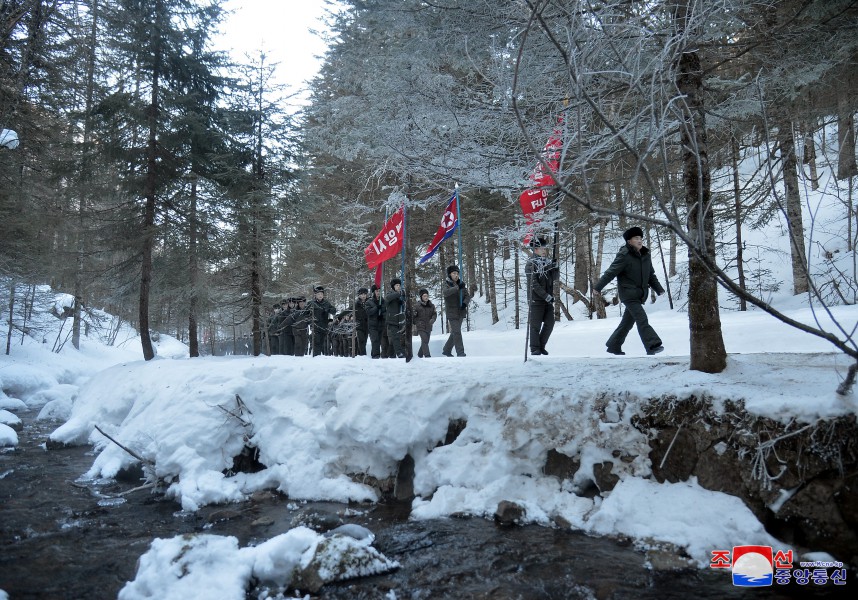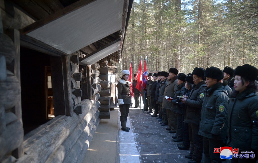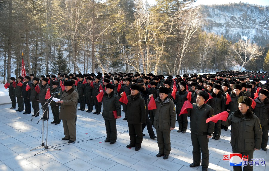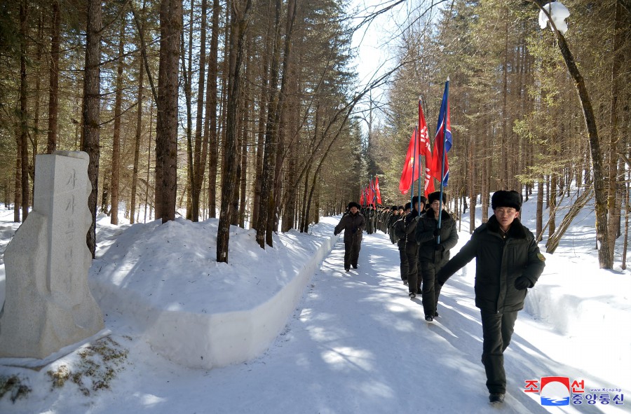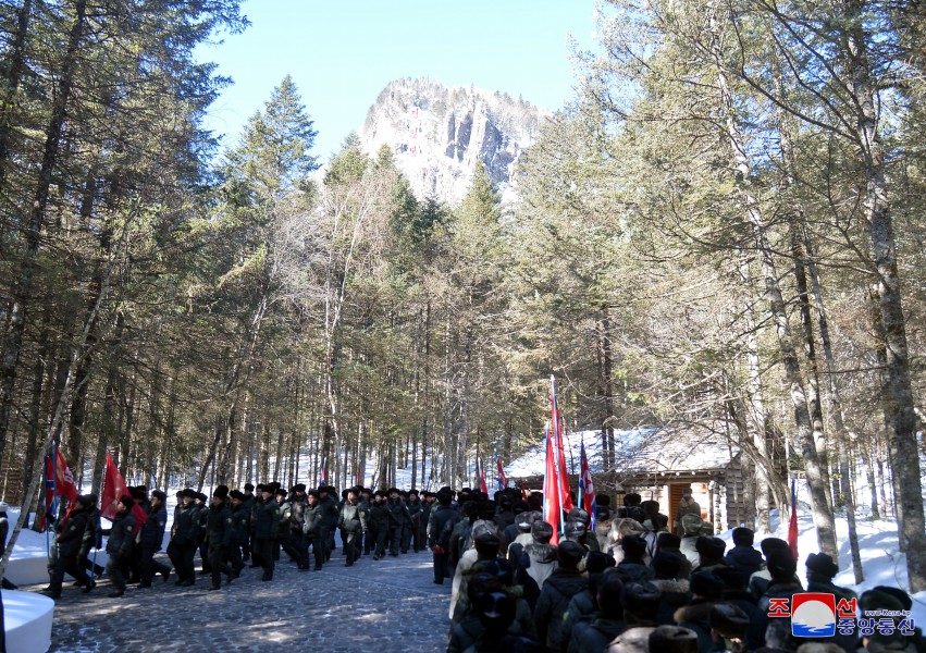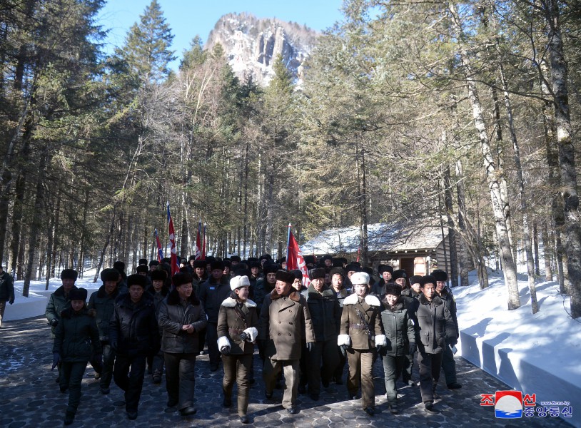 Výprava funkcionářů Svazu mládeže z celé země navštívila 16. února rodiště předsedy Kim Čong Ila v Pektusanském tajném táboře.