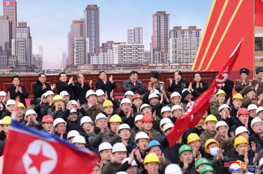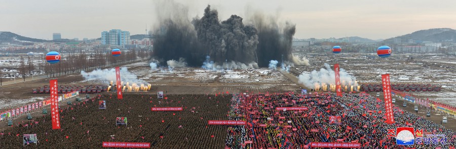 Vážený soudruh Kim Čong Un osobně stiskl tlačítko elektrického výbušného stroje, aby zahájil výstavbu obytných domů s 10 tisíci byty – třetí etapu bytové výstavby v oblasti Hwasong.