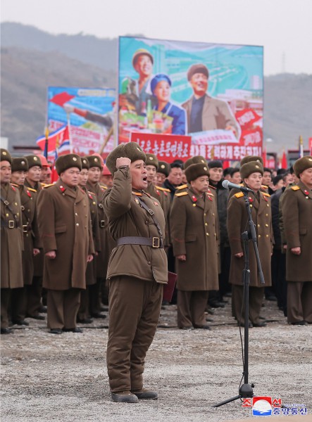 Soudruh Kim Čong Un se na paměť nechal vyfotografovat s veliteli a politickými komisaři stavebních pluků, naplněných nadšením energicky prosazovat v předvoji odpovědný a slavný boj za velkolepou výstavbu k realizaci důležitého rozhodnutí přijatého naší stranou jako nejvyšší rozkaz a absolutní pravda.