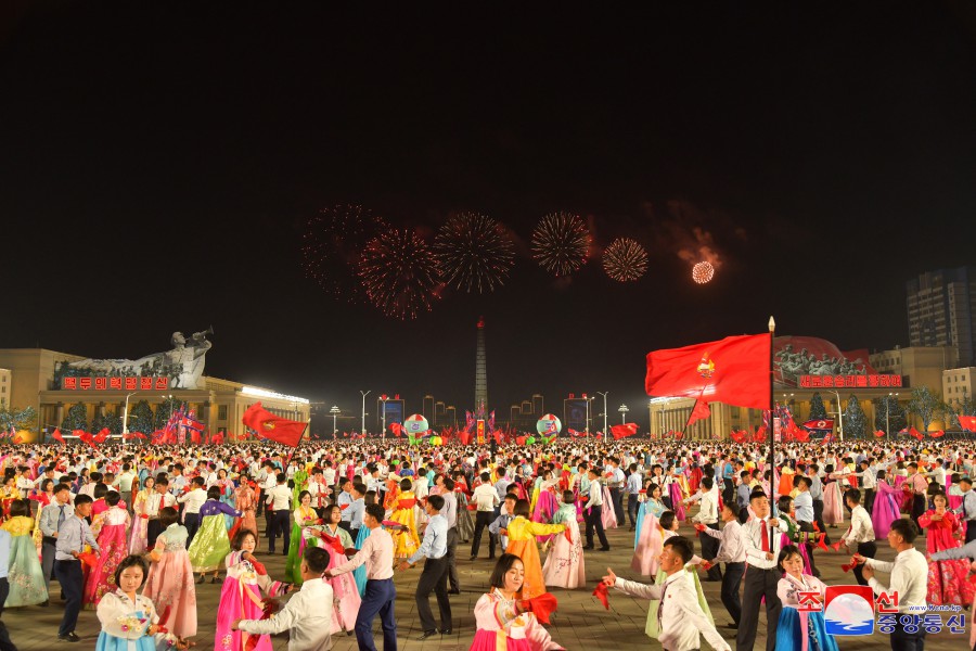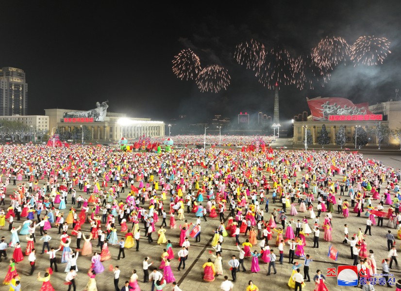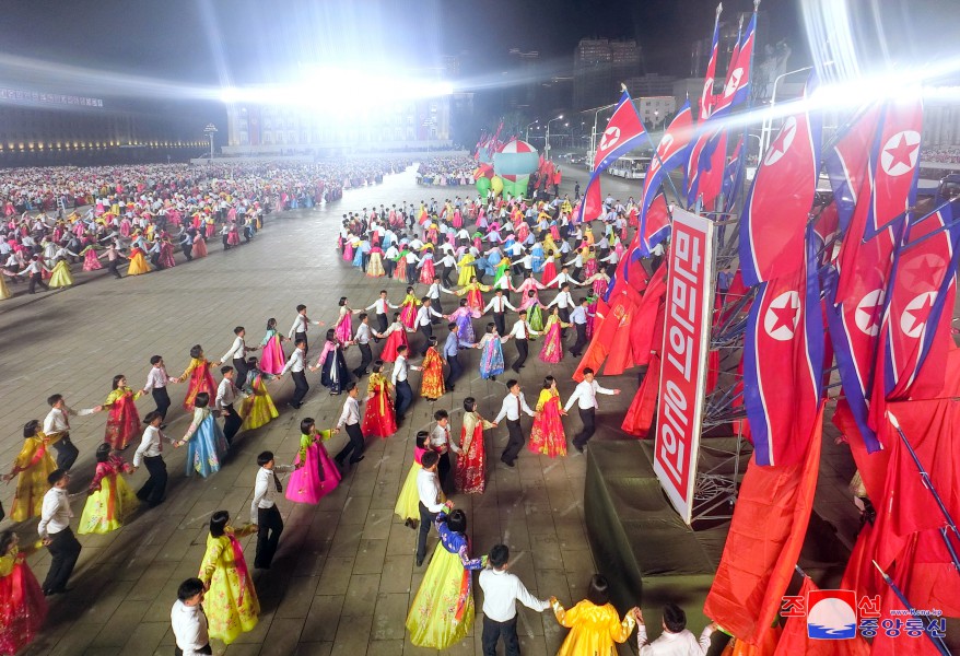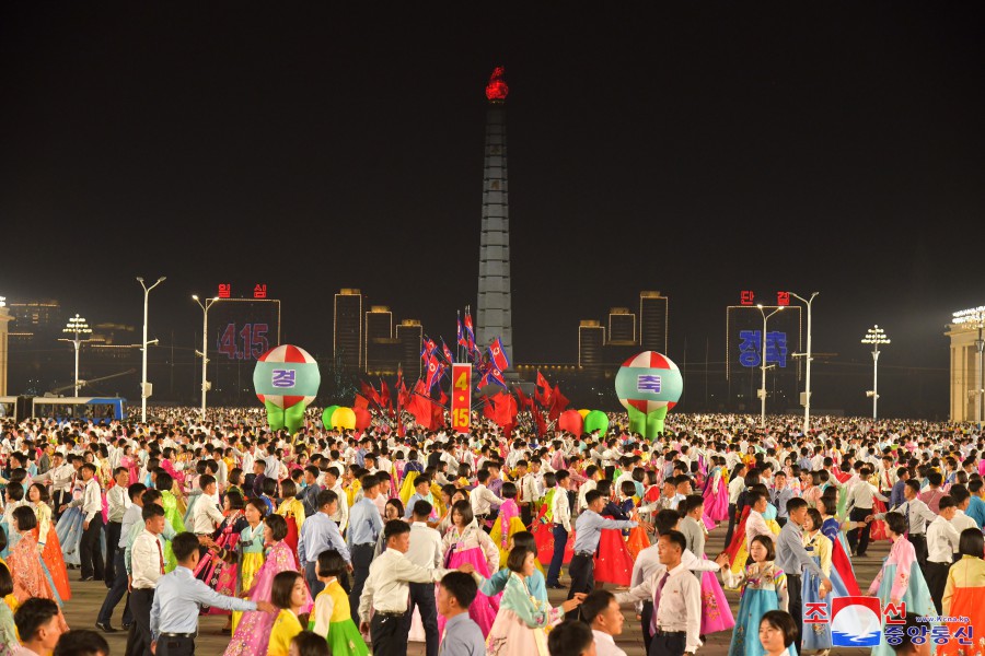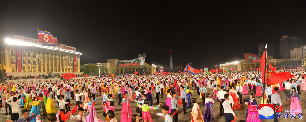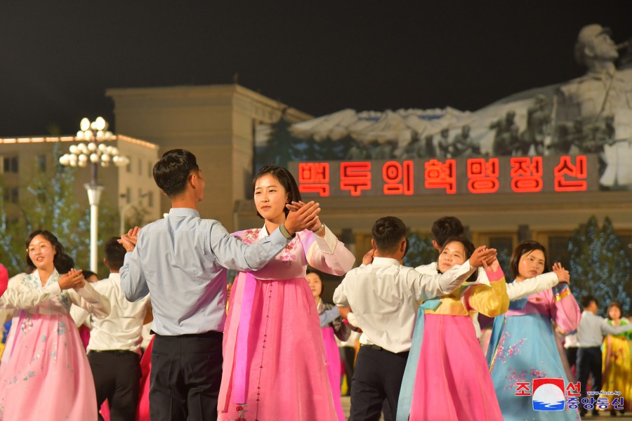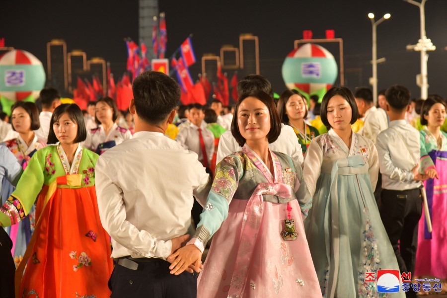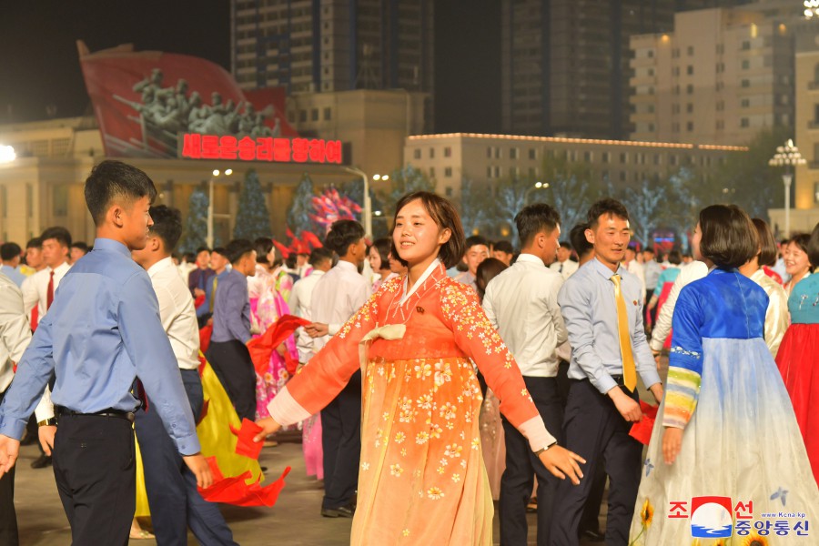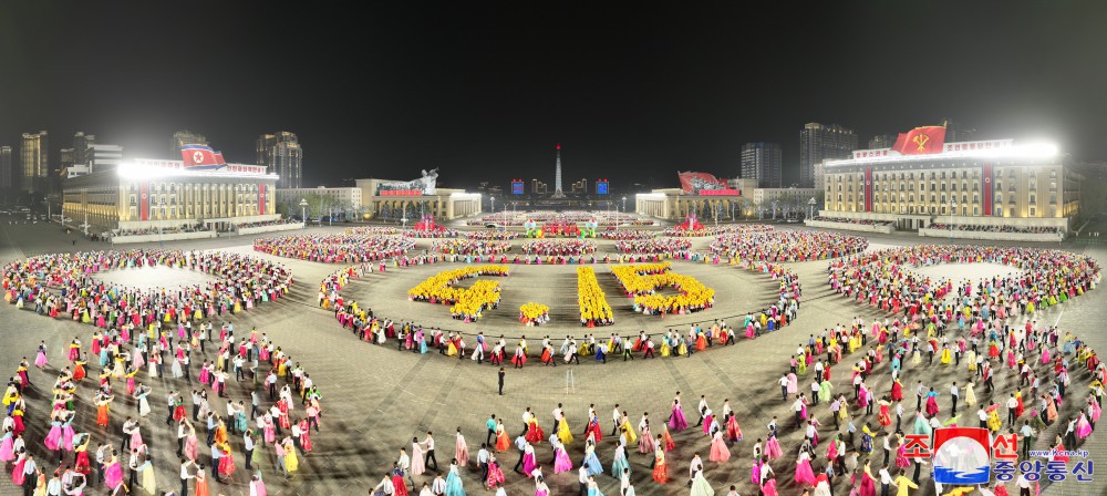 14. dubna večer se konala večerní taneční slavnost mládeže a studentstva na Kim Ir Senově náměstí v Pchjongjangu.