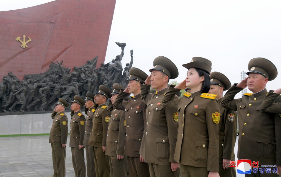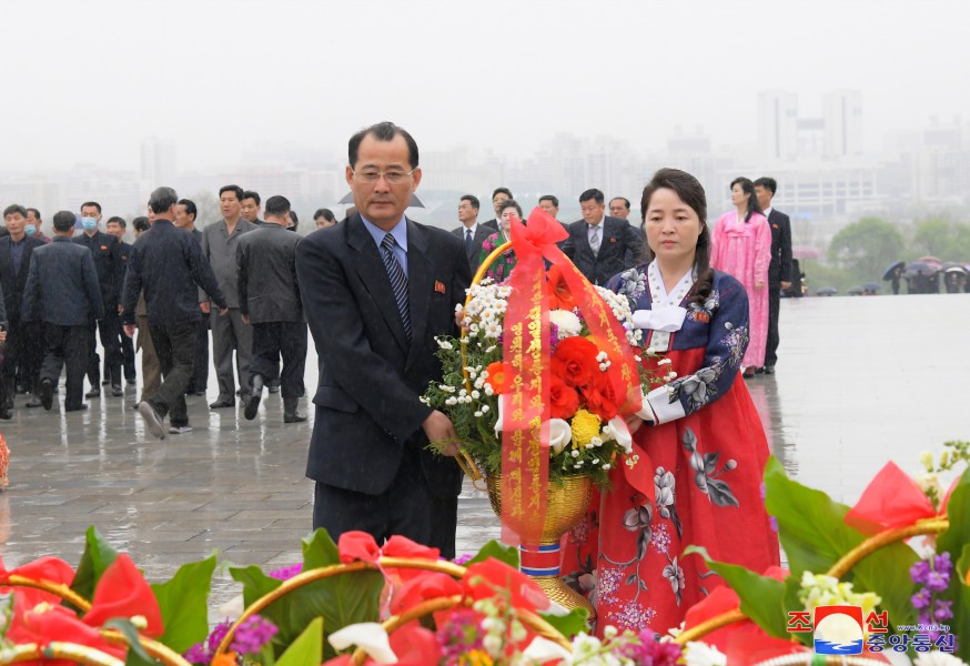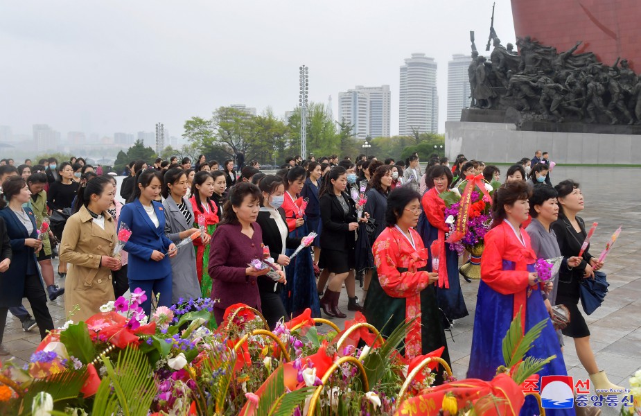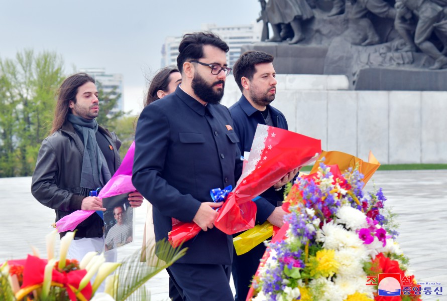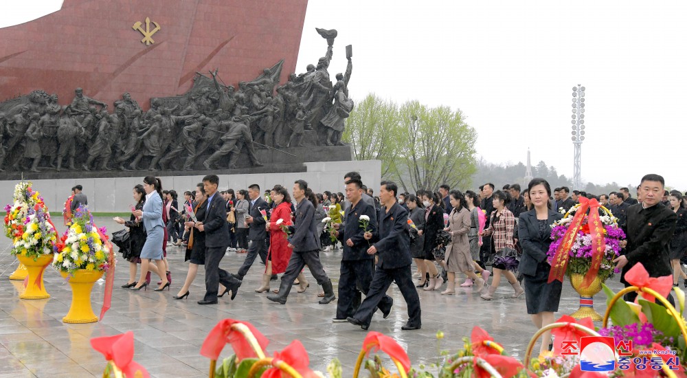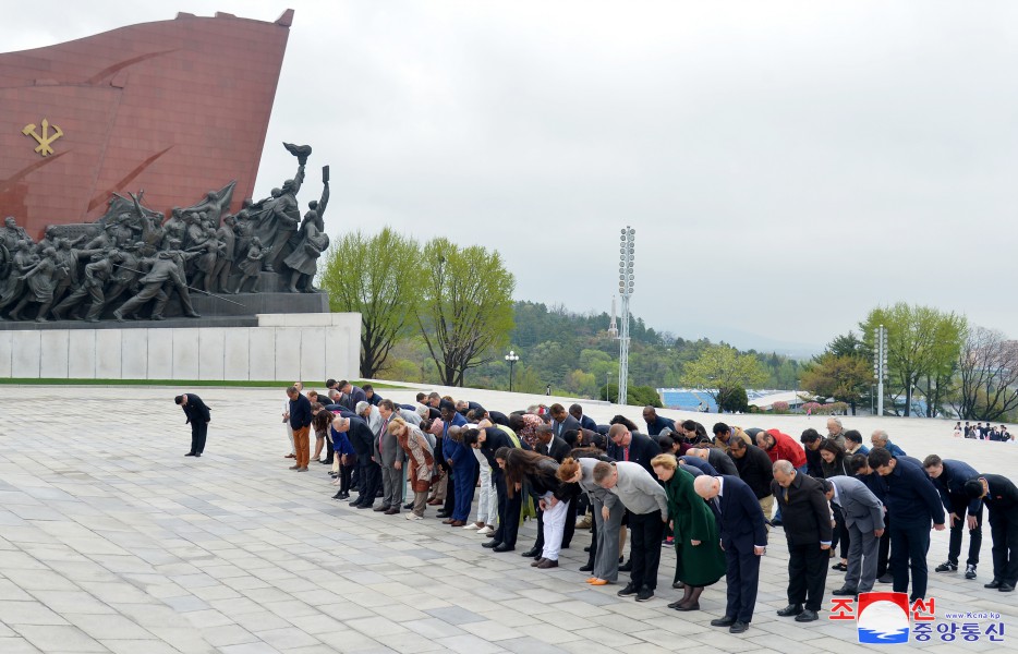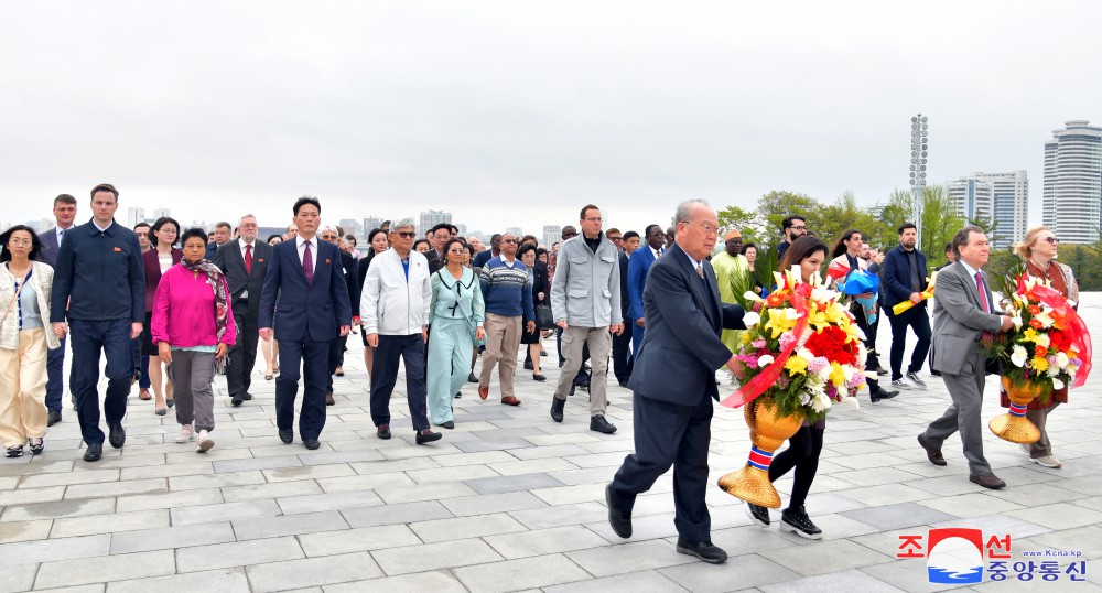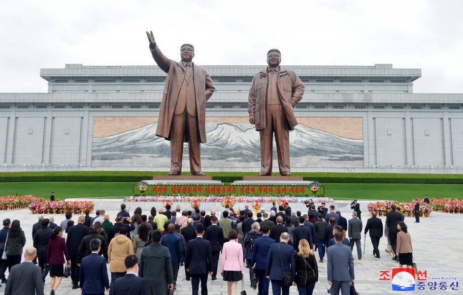 Účastníci mezinárodní konference o myšlenkách čučche položili u příležitosti 112. výročí velkého narození vůdce květinové koše a kytice květin k sochám velkého vůdce soudruha Kim Ir Sena a velkého vůdce soudruha Kim Čong Ila na vrchu Mansude.