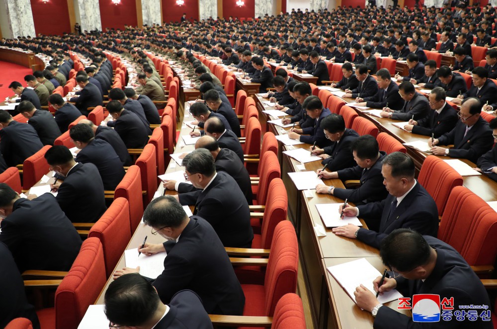 Všichni účastníci, poslouchající projev soudruha Kim Čong Una, zdůrazňující praktické způsoby, jak spolehlivě zaručit dosažení bojových cílů zaměřených na rázné zahájení nové éry velkých změn rychlým zvyšováním vlastní síly, se pozorně zapojili do diskuse k bodům programu jednání.