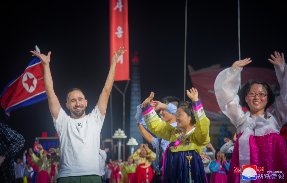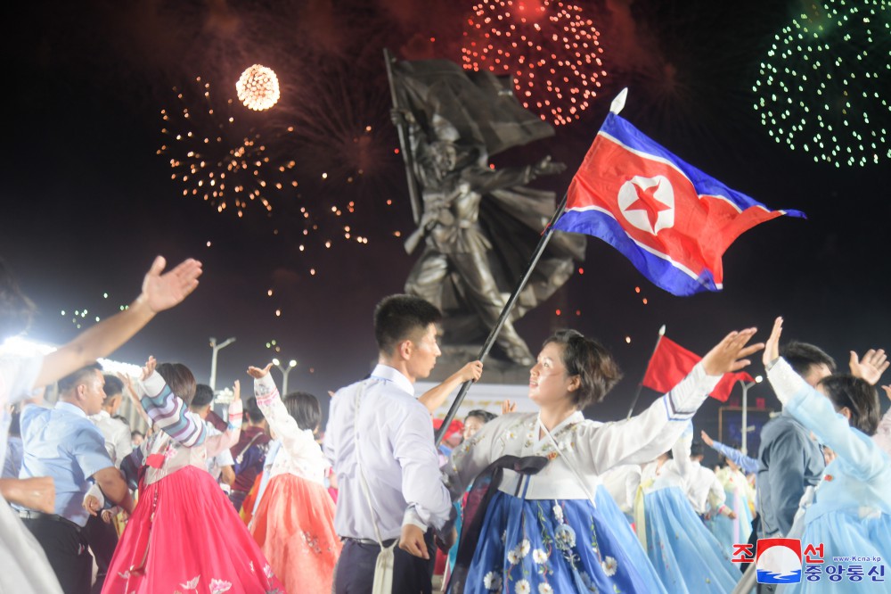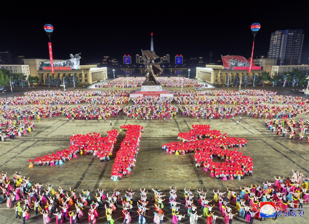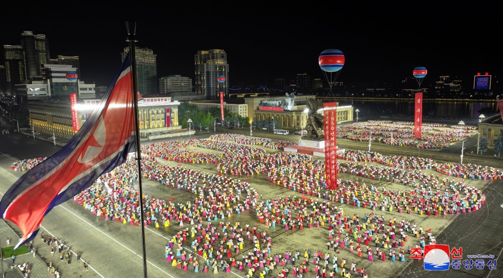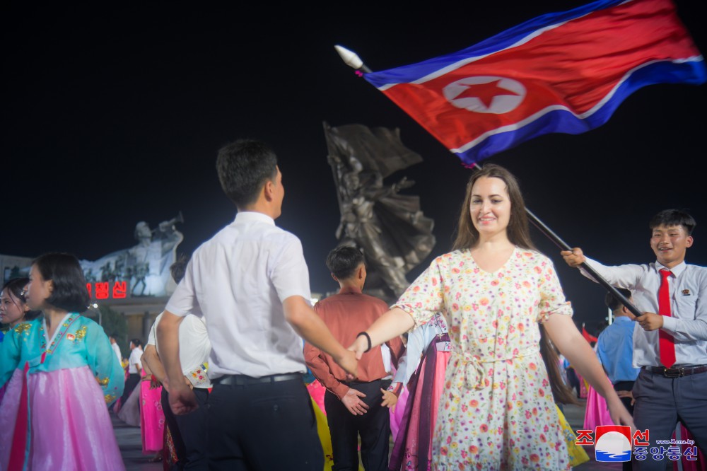 Účastníci tančili s pocitem bezmezné úcty k velkému vůdci soudruhu Kim Ir Senovi, který pozdvihl všechen lid a vojsko lidové armády do rozhodující války, aby odrazil agresory a bránil posvátnou rodnou zemi za cenu krve, čímž dosáhl zázračného vítězství, jež bude oslavováno na věky věků.