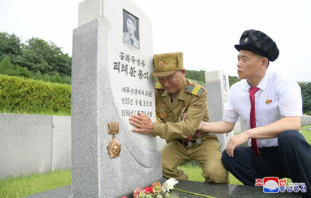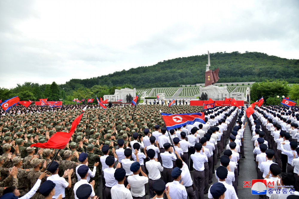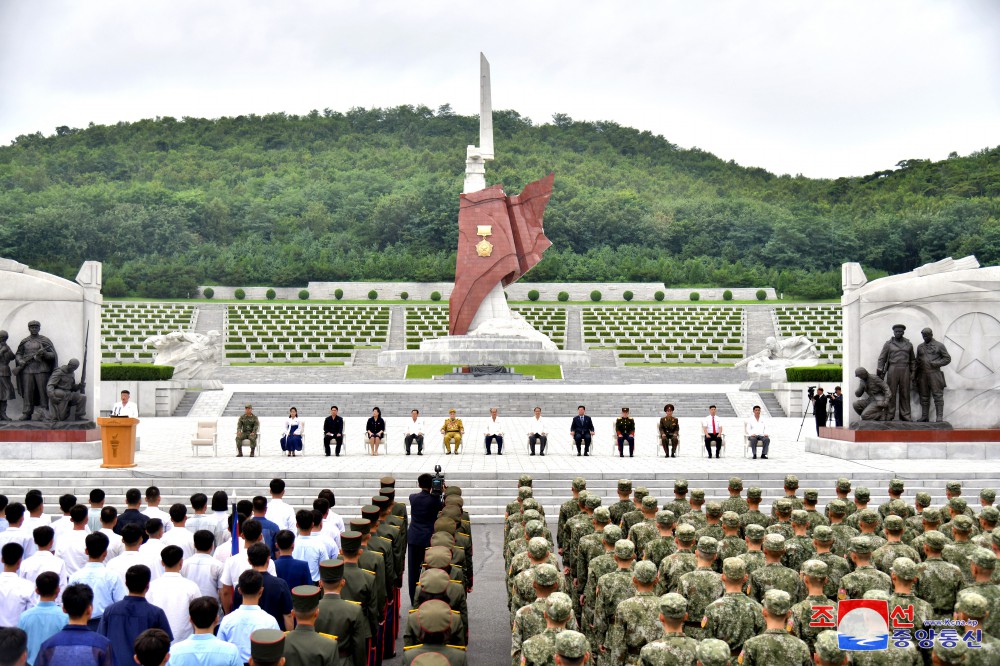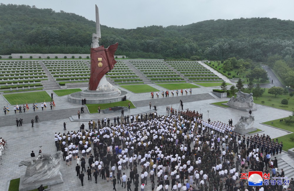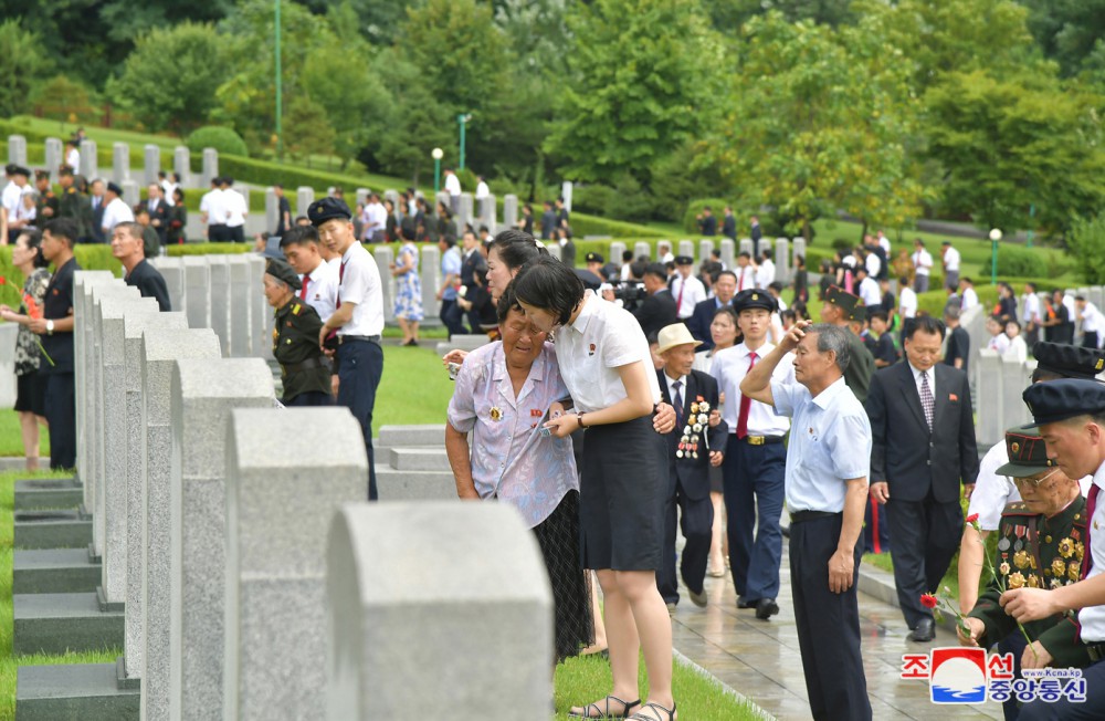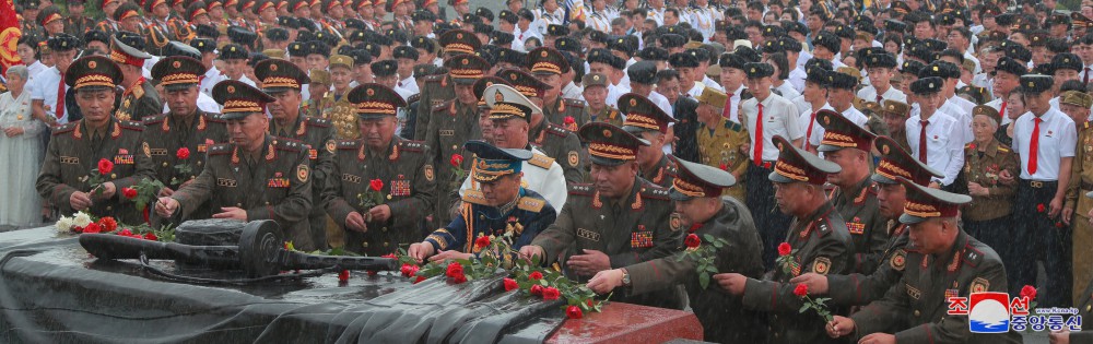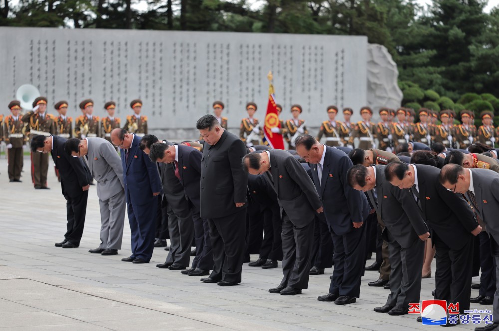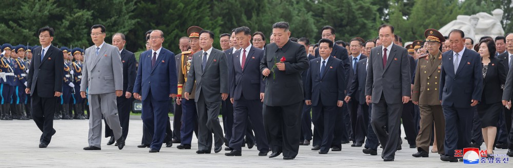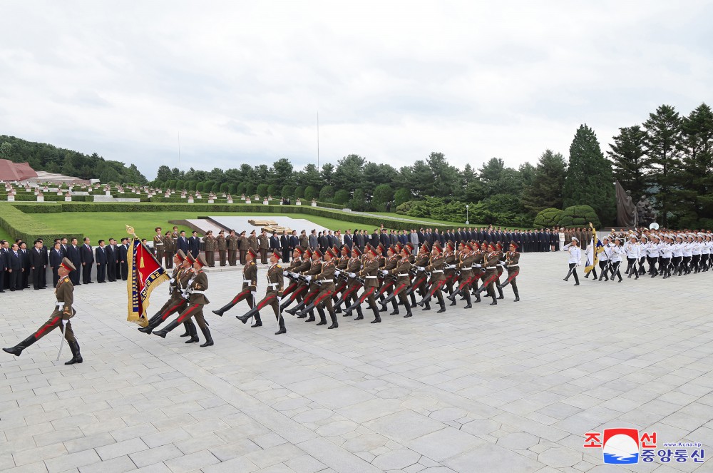 Generální tajemník Korejské strany práce a předseda pro státní záležitosti Korejské lidově demokratické republiky vážený soudruh Kim Čong Un u příležitosti 71. výročí vítězství ve velké Vlastenecké osvobozenecké válce navštívil odpoledne 26. července společně se členy ústředního řídícího orgánu strany Pohřebiště revolucionářů Tesongsan.