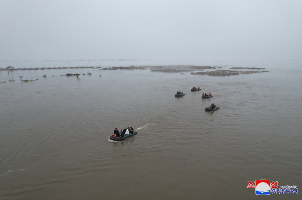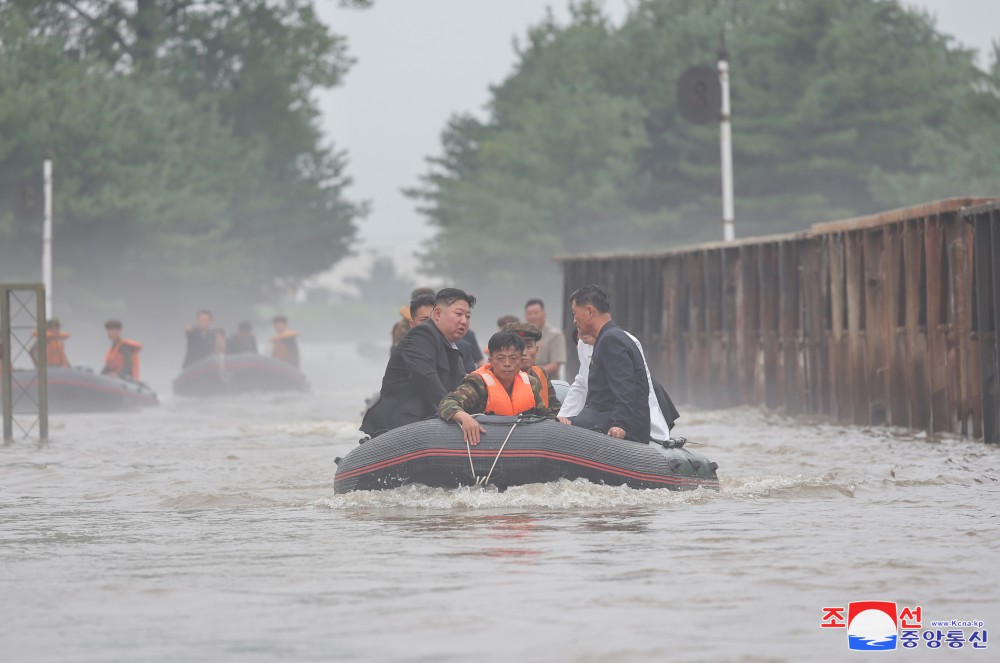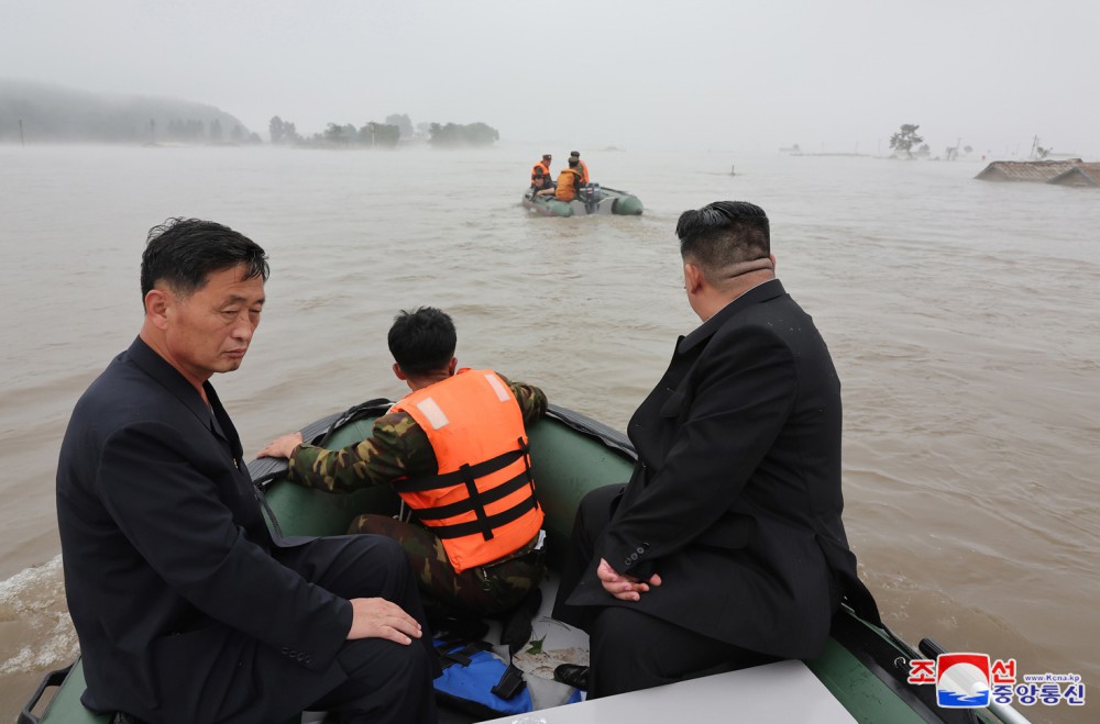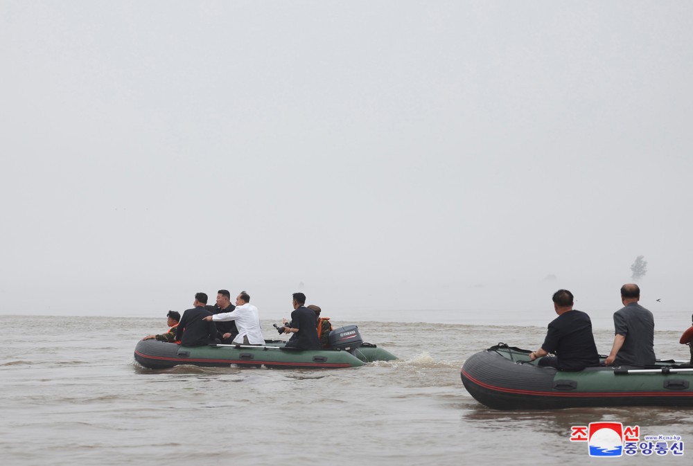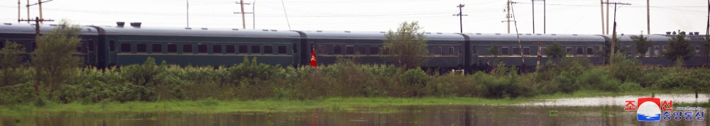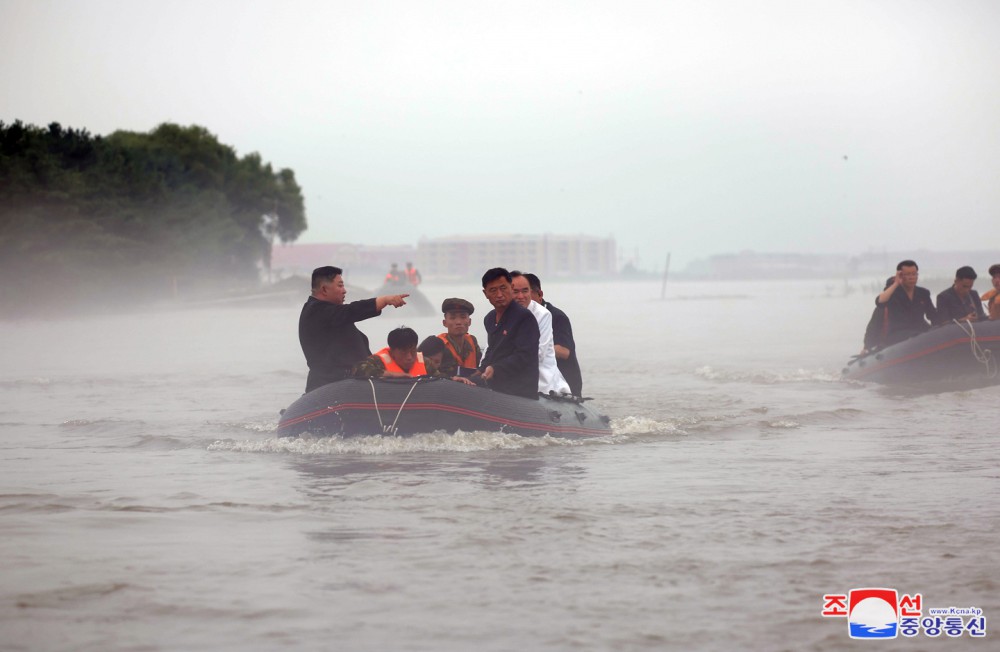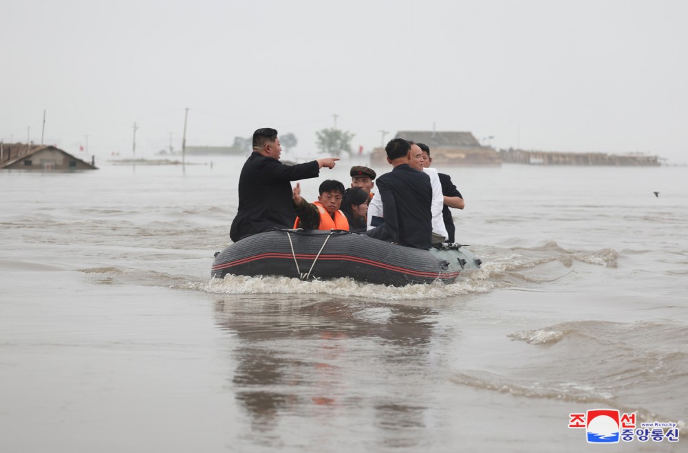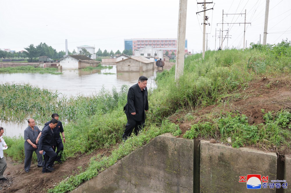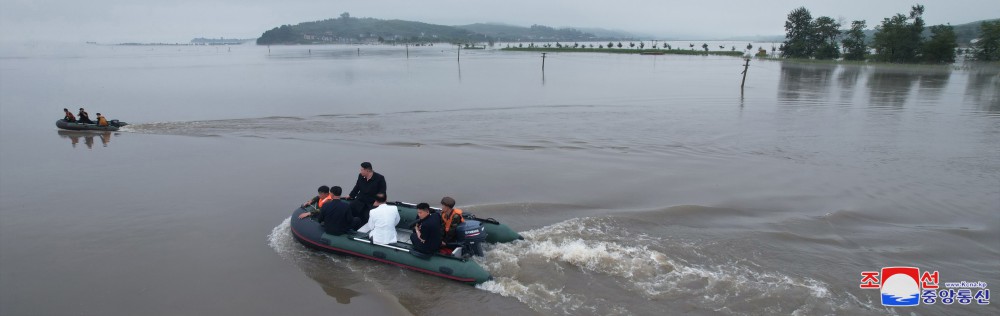 Před jednáním si vážený soudruh Kim Čong Un prohlédl zatopené oblasti spolu s premiérem a tajemníky Ústředního výboru strany.